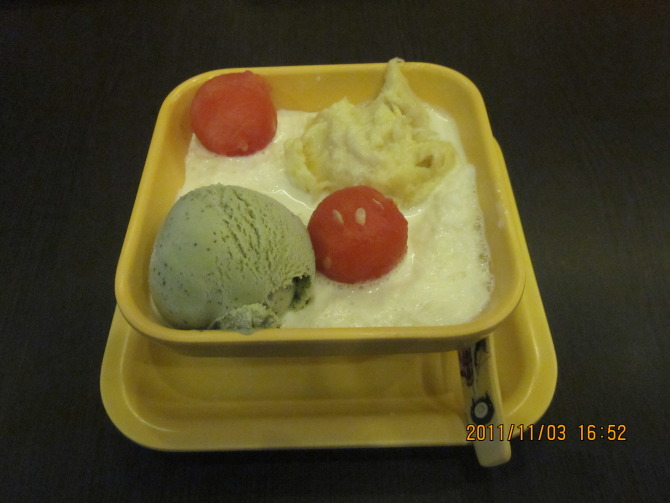 雪山榴莲抹茶,连旁边的小碎冰块都是榴莲味的啊,抹茶冰淇淋也很细腻,绝对一级棒!不得不说一下老婆选中它的理由:点单上的图,就它画得最大,说明应该是拳头产品~这一招以后要学学