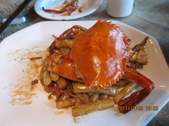枪蟹炒年糕,这个灰尝地好吃啊!蟹也够大,不止半斤,一只就炒了一碟菜,而且看上去比年糕更多。后面在白鹿还想点这个菜,可惜卖光了