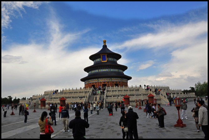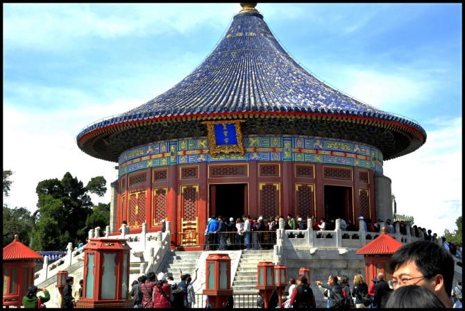 出门找到建国门地铁站,坐地铁1号线,在东单换5号线,在天坛东门下车,从A口出,买门票(35元). 皇帝祭天的场所~包括圜丘和祈谷二坛。