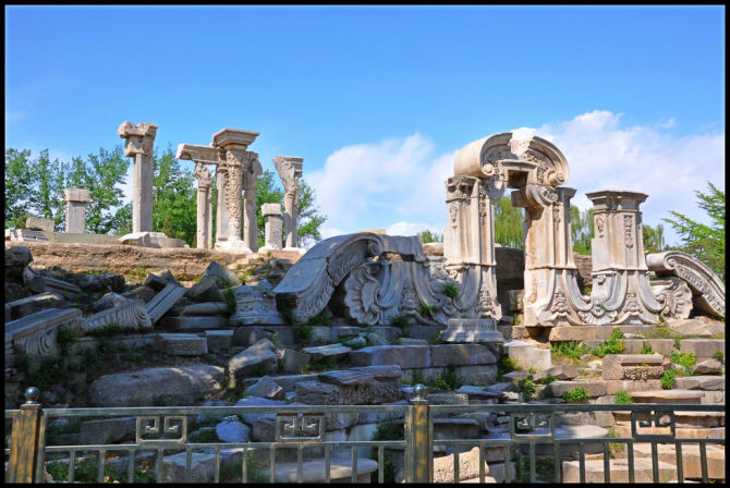 圆明园与颐和园紧相毗邻。它始建于康熙46年(1709年),由圆明园、长春 园、万春园三园组成。是清朝帝王在150余年间创建和经营的一座大型皇家宫苑。1860年10月,圆明园遭到英法联军的洗劫和焚毁,此事件成为中国 近代史上一页屈辱史。