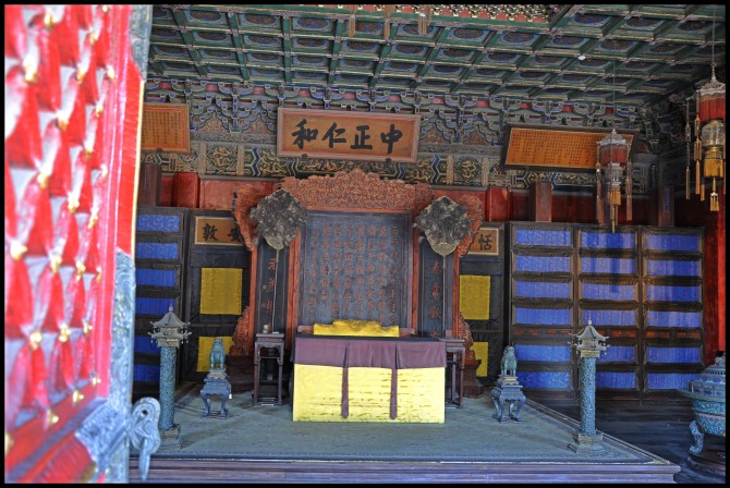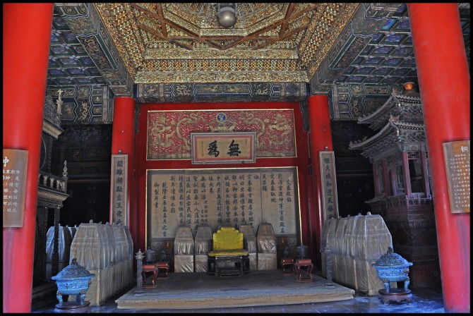 殿中明间设宝座,上悬康熙帝御书“无为”匾,宝座后有板屏一面,上书乾隆帝御制《交泰殿铭》