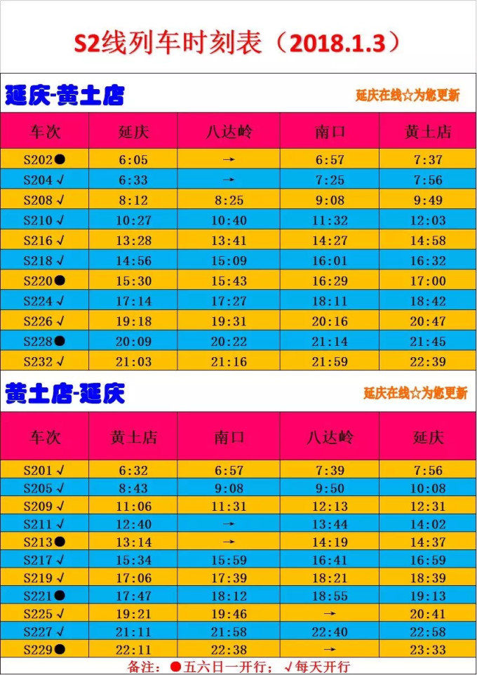 当然对于动车来说最重要的就是班次啦,你可以关注微信公众号“延庆在线”,在那上面你可以找到一切关于S2的信息。
