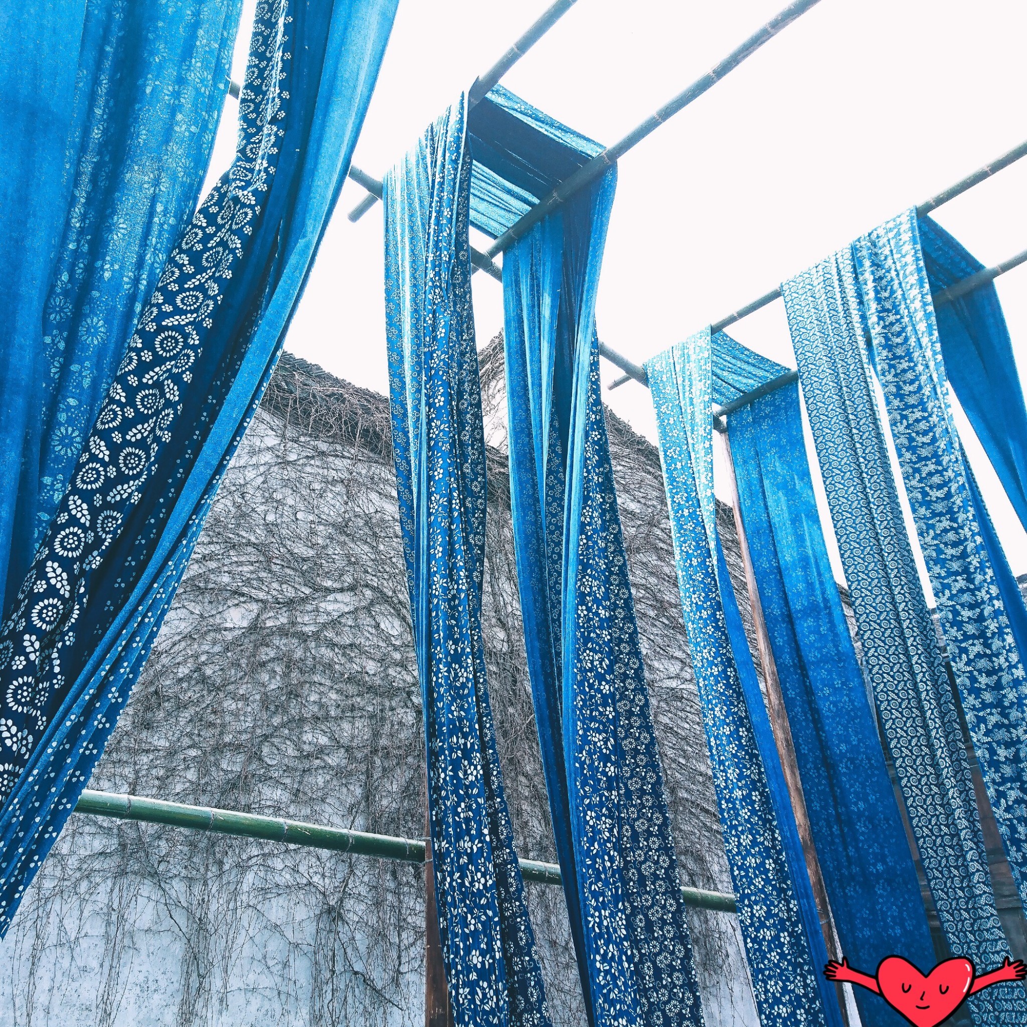 藤蔓在墙上作画,配上蓝蓝的天空,与飞舞的染布,是不是怎么拍都文艺呀^^