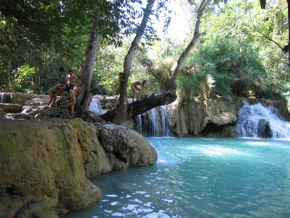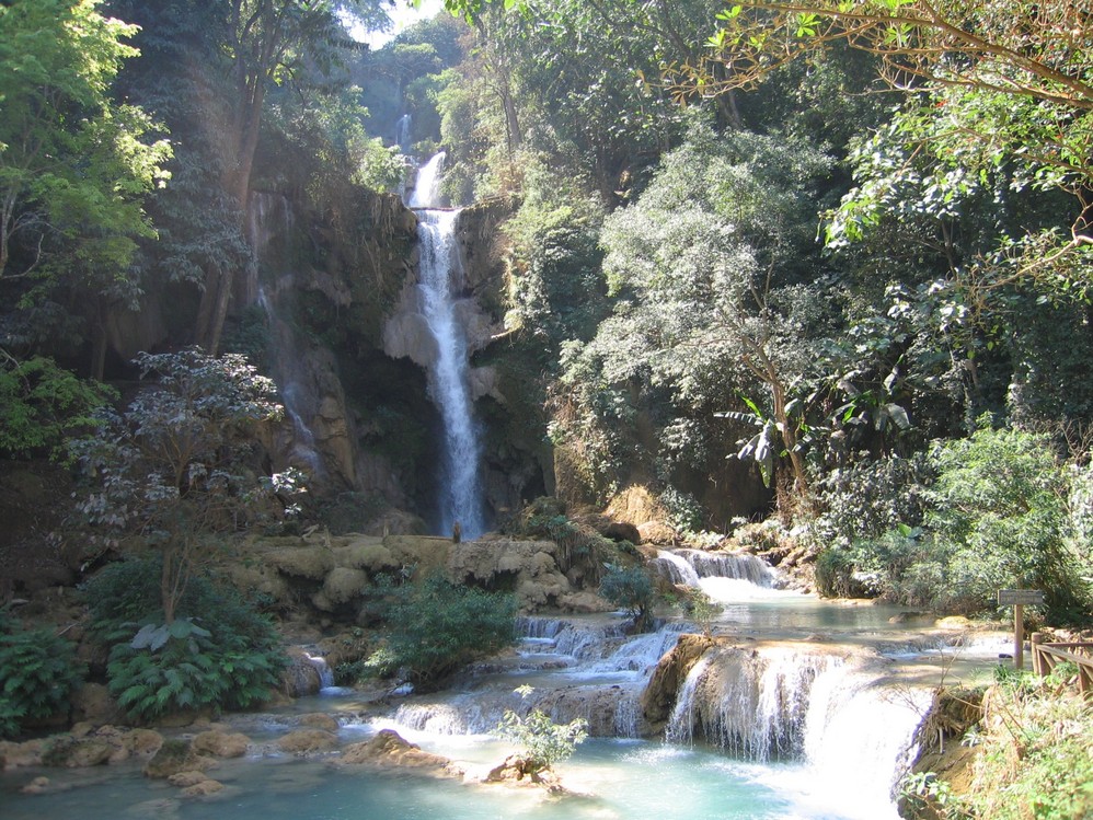 市区南面32公里处考安西瀑布(/poi/5485579.html)(Tat Kuang Xi),只有搭Tuktuk和Minivan(小面包车)前往。我们路遇两日本人一起与Tuktuk司机谈价还到30千kip/人(包括往返,等待),司机在马路上转了几圈又拉了两人(35千kip/人)才出发。多层瀑布从石灰岩岩层上直流飞下,冲入片片深潭的薄荷綠碧波中,许多西方游客在那里嬉水。