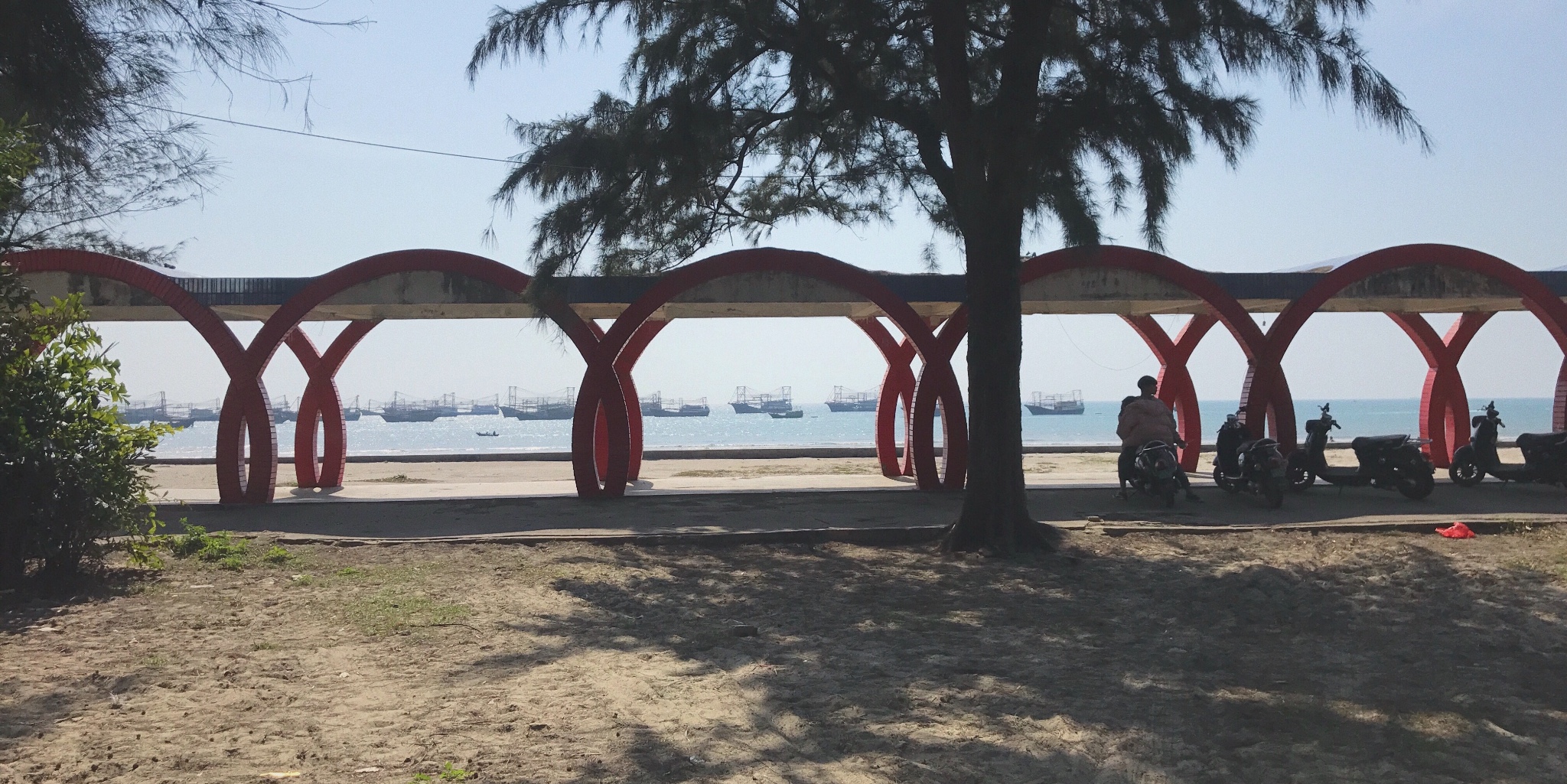 路过一个渔港,木船的漆和海水的蓝绿色交相辉映,看的我入神,我就坐着看着渔船来往,渔民光着脚成排坐在船上着歇息。