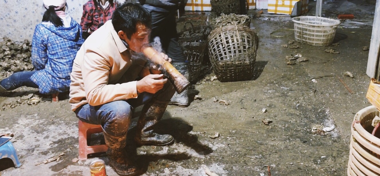 捡到了便宜,我又去碰碰运气。卖生蚝的老板生着火堆在一旁抽大烟,漫不经心的解释到:“我这是竹筒烟,鸦片的老祖宗。” 可能是因为我夸他抽大烟好帅,他10块钱卖了我3只比巴掌还大的生蚝。