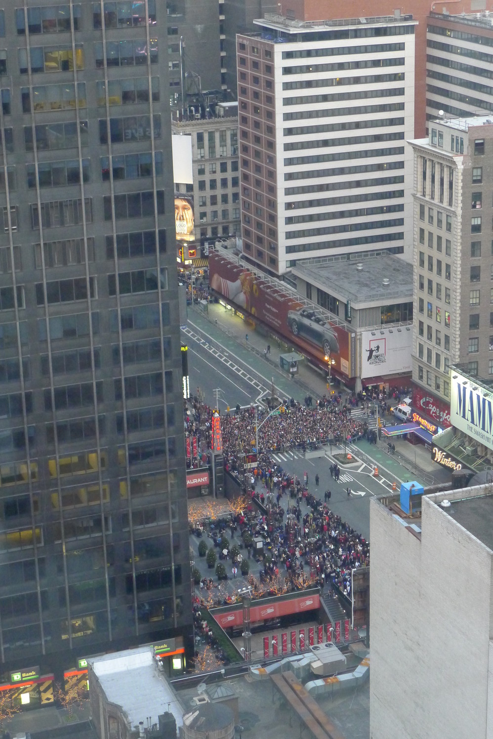 这是我在新年倒数的时候拍的,看到下面站成方块的人群了么?这些人要在寒风中从下午3点站到12点,这不是人干的,我自认没有这个能力。