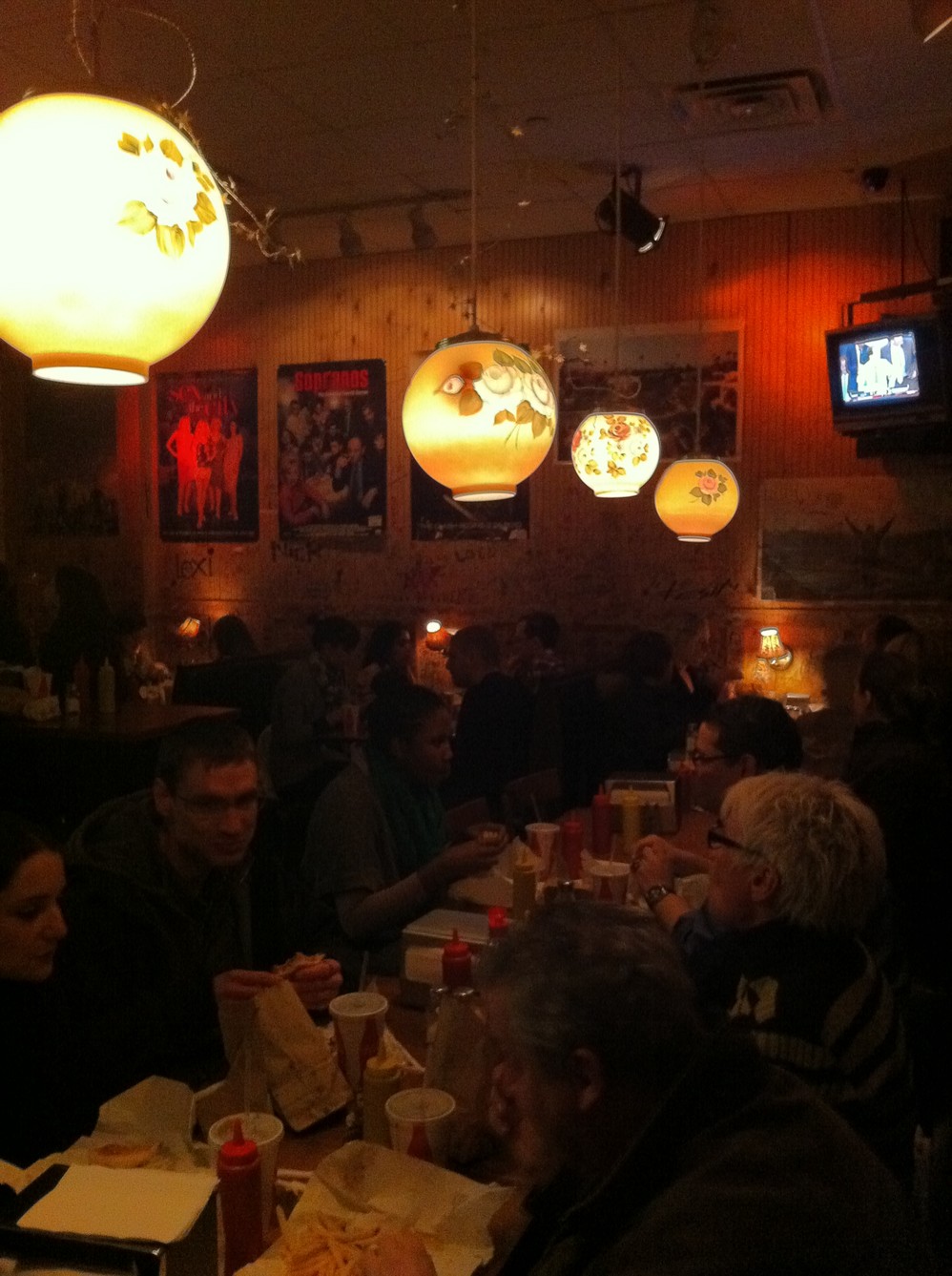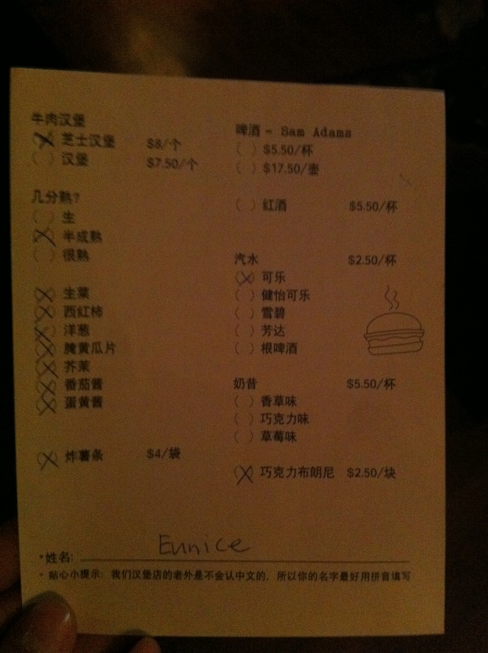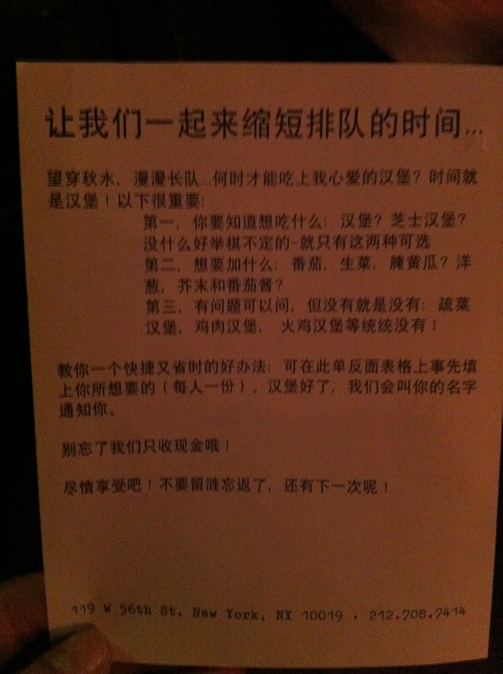 这家传统的美式快餐店,非常难找,叫Burger Joint, 藏在一个酒店的帘子后面,唯一的标志就是那个汉堡 包形状的霓虹灯。店小,排队,点菜的纸条还有中文版的,而且写的十分搞笑。