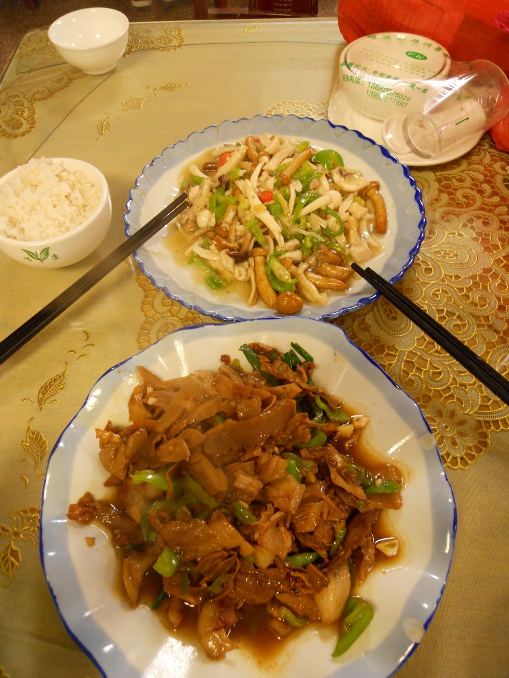 到房间休息一下就出门觅食了。其实晚饭可以在枫枫 吃,但是要提前预定,老板娘会根据你想吃的东西去菜市场买菜,我们没有提前说,所以没我们的菜,只好出门去找。(第二天在枫枫 吃了,才发现还是这里吃实惠,而且老板的手艺也不错哦。)出门才发现武夷山 人真是厉害啊,好像不用吃饭是的。满街都是茶叶店,饭店很少,我们在枫枫 周围逛了一大圈,只有几家,卖的都是山珍啊---各种蘑菇,贵的很。最后还是找了家人少的小店吃,当然主要也是吃蘑菇,俺们挑了点普通的,不那么贵的,话说味道还是不错的。里边基本都是蘑菇,有点点肉末,价格不记得了,就记得贵了~不过话说没见的蘑菇么,也值了。