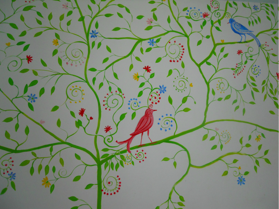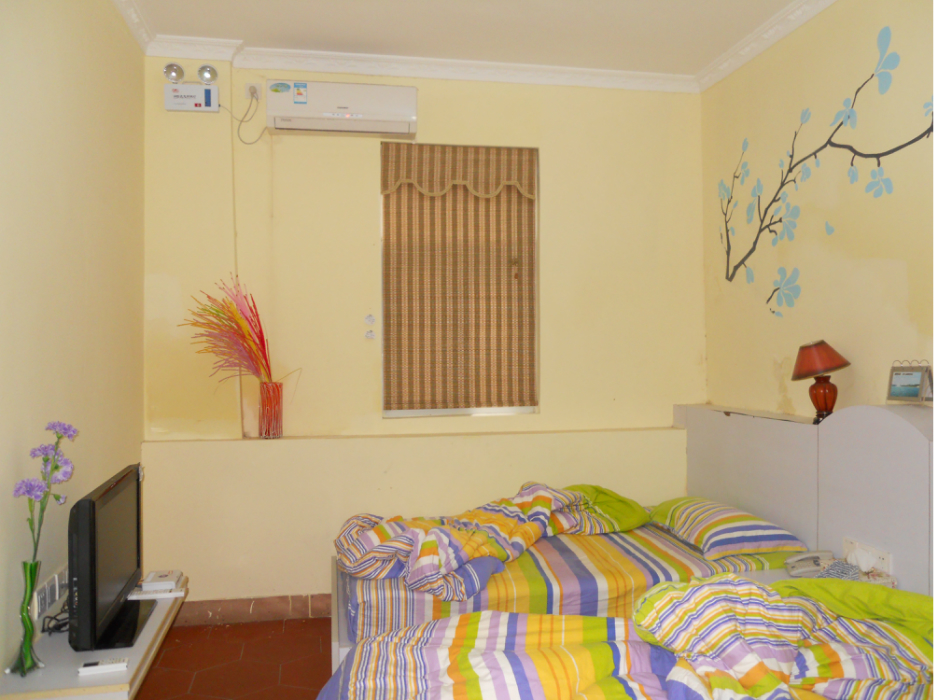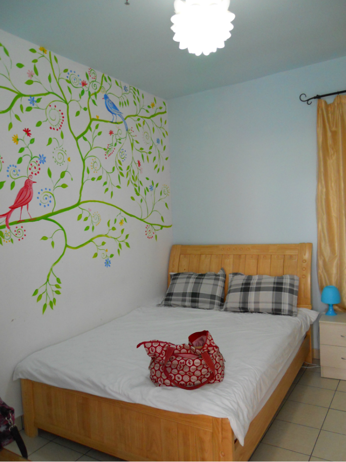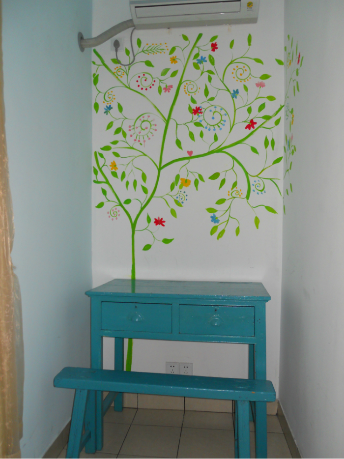 房间隆重登场,也是淡青色的哦~漂亮的墙绘,真的是和实物一模一样哦,超级干净,超级整齐,我这个洁癖都满意极了呢。而且房间里放了清新剂,一直散发着一股淡淡的清香,好舒服。而且房间一点也不潮湿哦,这个最让人满意了~老板说他们每天都要做除湿的工作的哦~