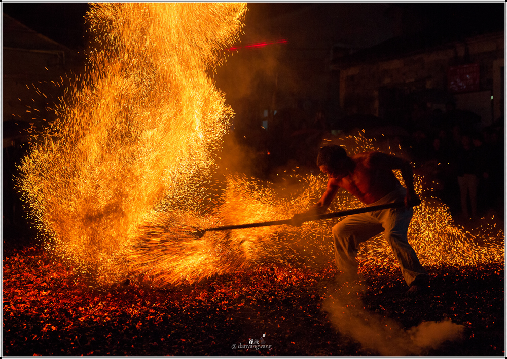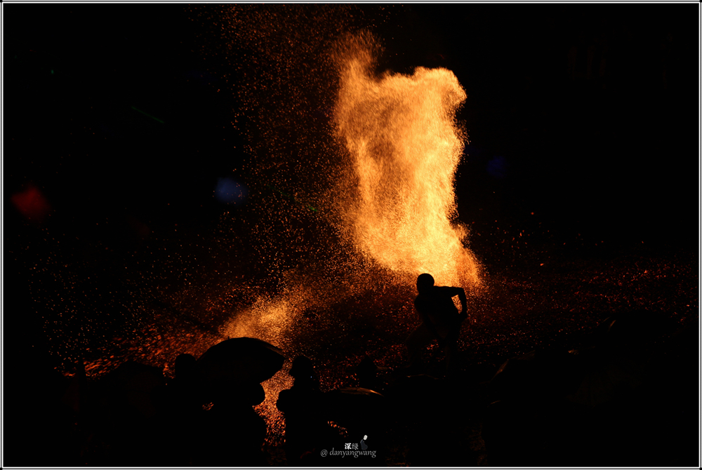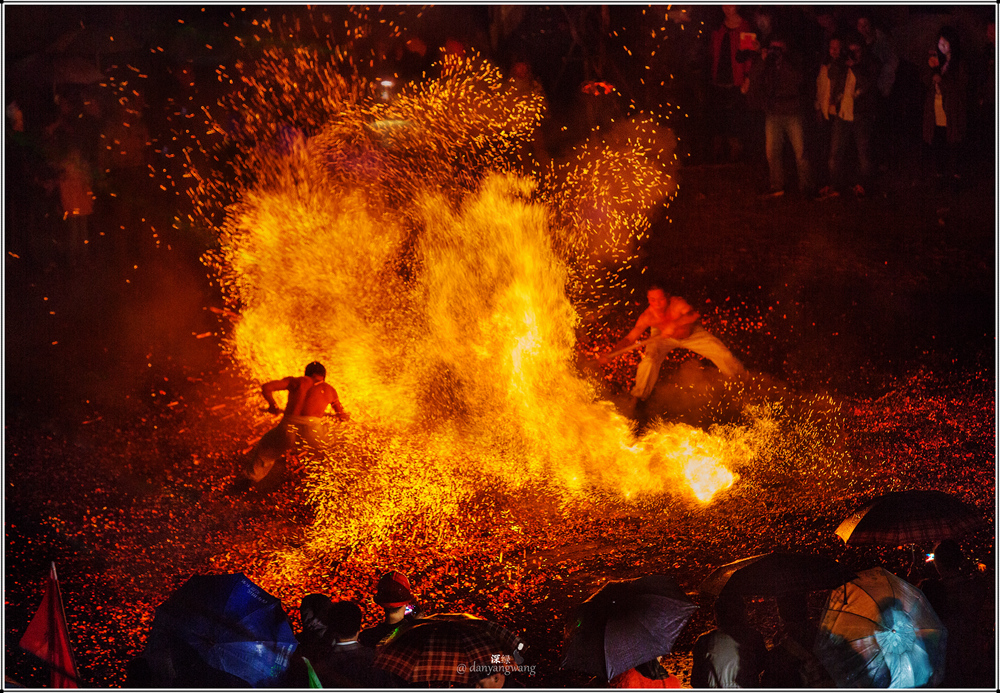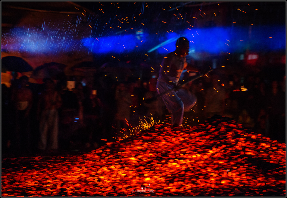 第二轮接着开始。顾不得下雨了,拿出相机挤到前排,为了不影响后面的人,就蹲着拍。火堆高度慢慢降低,铺开了,一轮轮过去,大约只有20来公分的厚度时,那些拿木棍的人,往火堆一扫,“轰”,四射的火星腾起一丈来高,整个人被裹了进去,烈火焚身,浑然不惧。看那些火星,竞变幻出各种动态的图案来,马奔虎跃,龙飞凤舞,活灵活现!