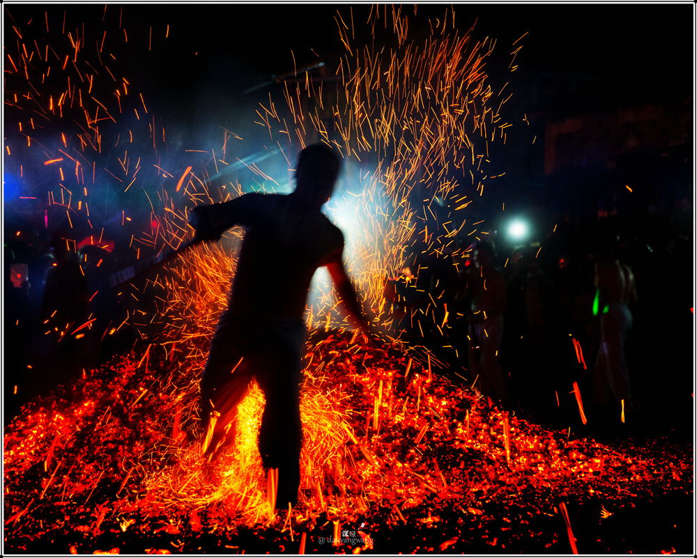仪式马上要开始了, 汉子们站好队列,随着一声大喊,第一个汉子已往火堆里冲去,接着第二个、第三个……,飞奔过火堆的片刻,火星瞬间腾了起来,亮亮闪闪如烟花,很是美丽!踩火堆也是有技巧的,扬起的火星越高越大,说明“功夫”越高,伴之而来的是高昂地惊叹和欢呼声。汉子们无一示弱,踩过火堆时双脚不抬起,用脚面拖一段,火星就被扬起来了,不能太深,容易绊倒,太浅也不行,不深不浅恰到好处。