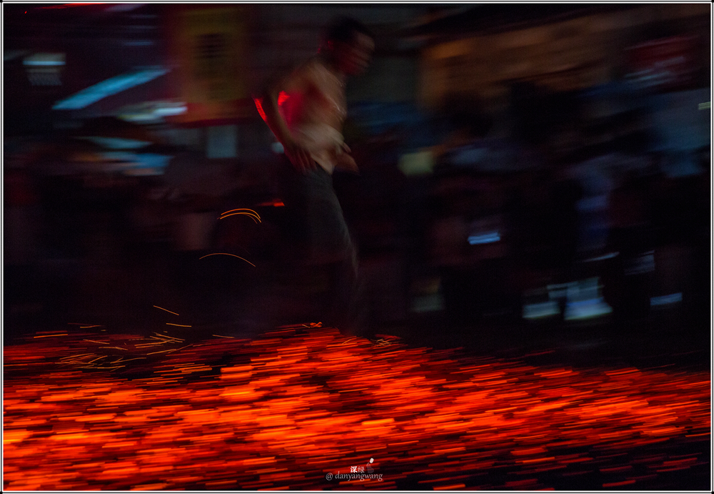 一轮过去,火堆被踩平了不少,场面也热烈起来。实在有些好奇,看他们的双脚并无特别之处,何以踩在摄氏700多度的炭火上毫发无损?此时我很想拿起他们的双脚看看有什么门道:)