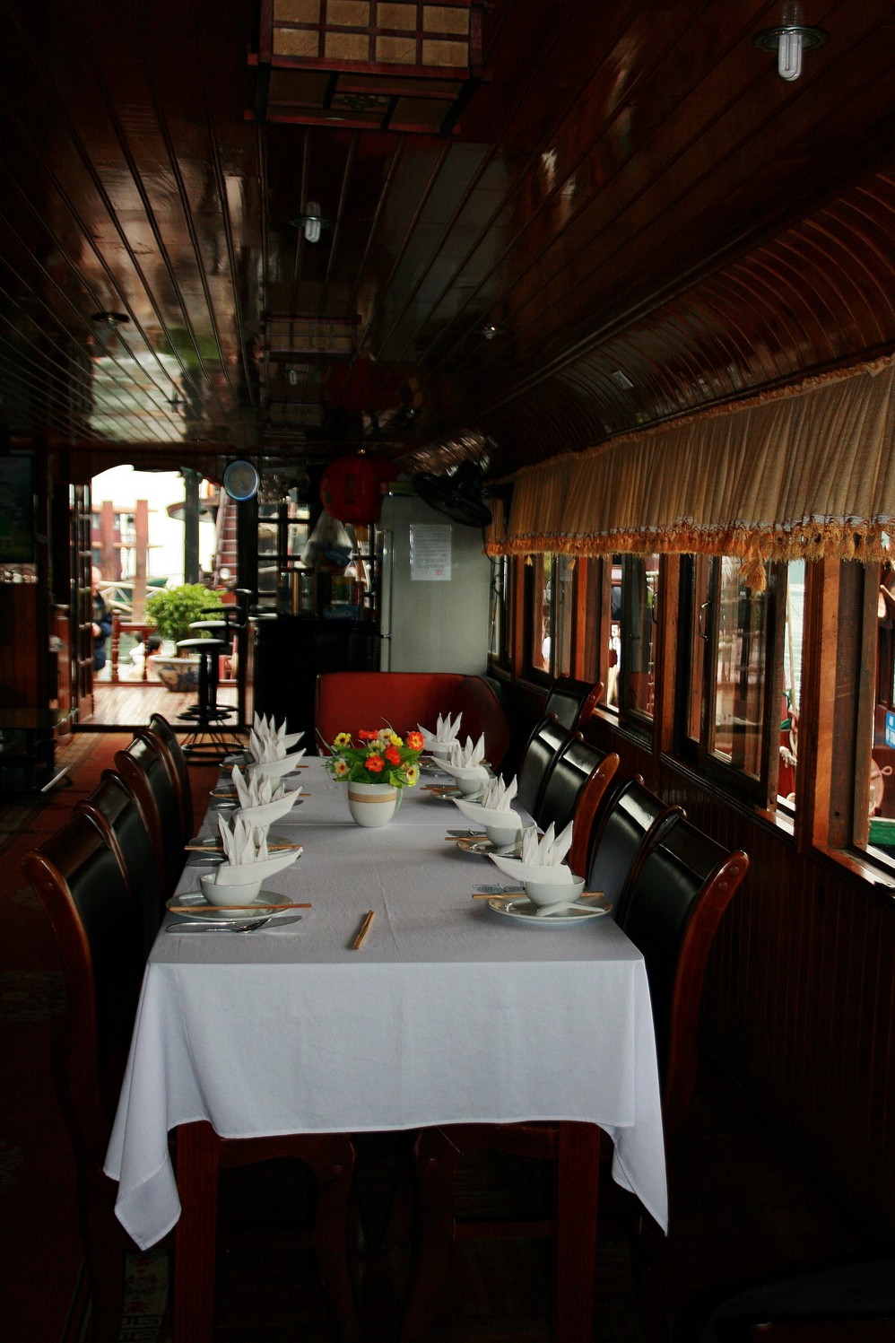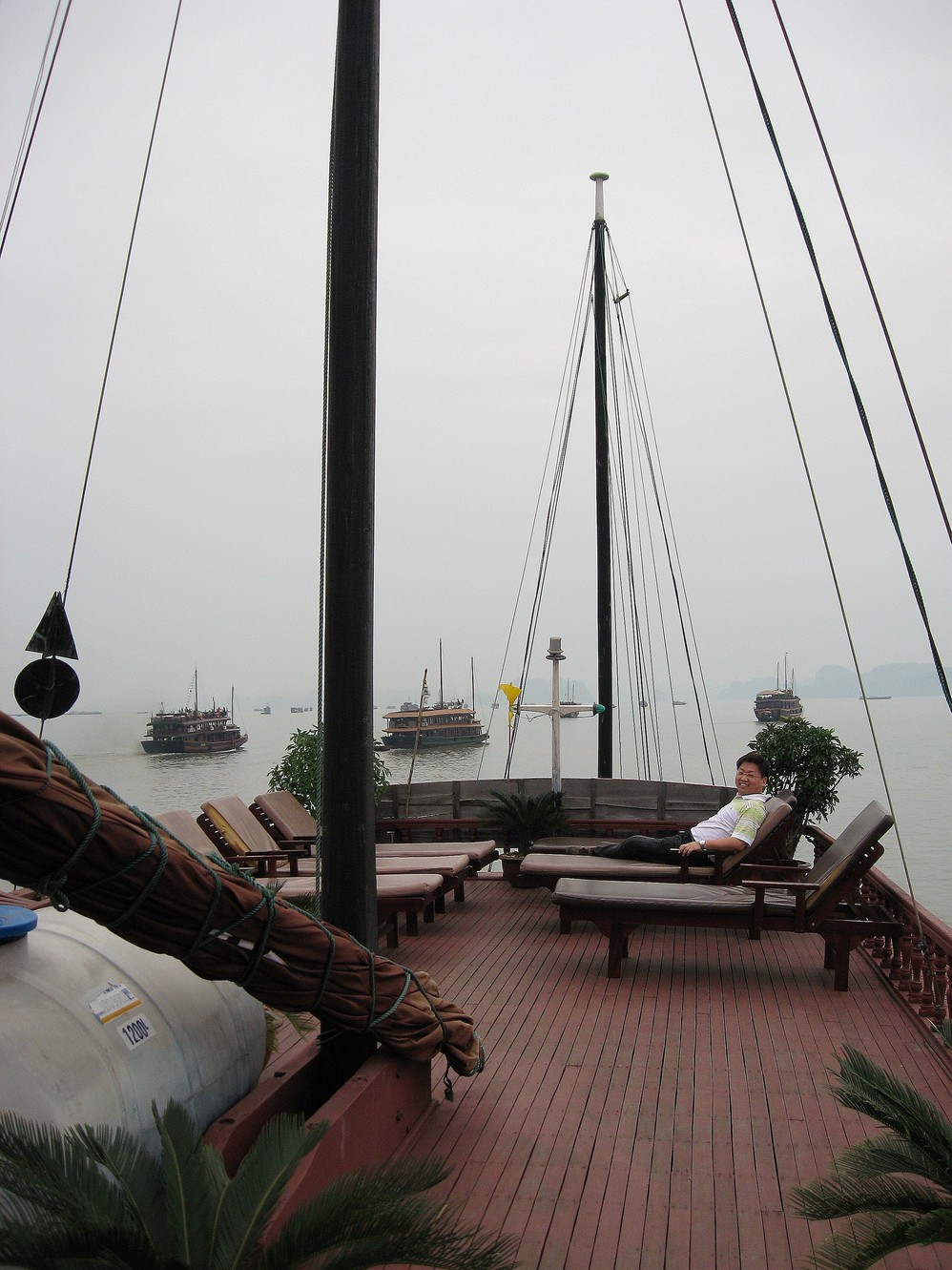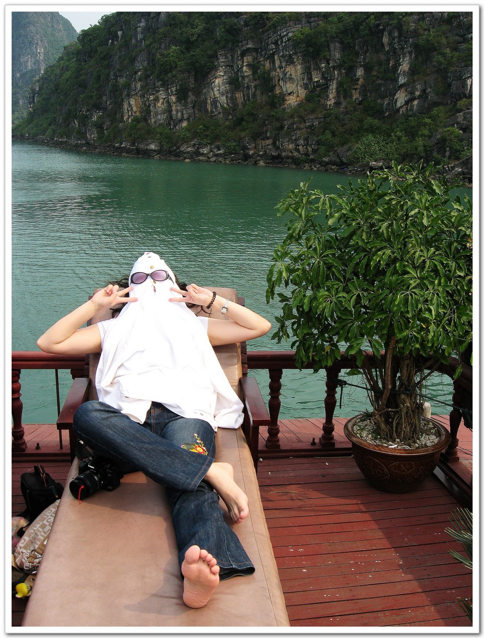 5)晚上船会停靠在几座山峰之间,比较平静。船家提供卡拉ok,我们的船上的人相对比较保守,没人开唱。隔壁船的是一群欧美年轻人,刚入夜就开船,而且好像还有打分,谁唱得不好就跳水。还真有人跳,真够high的。