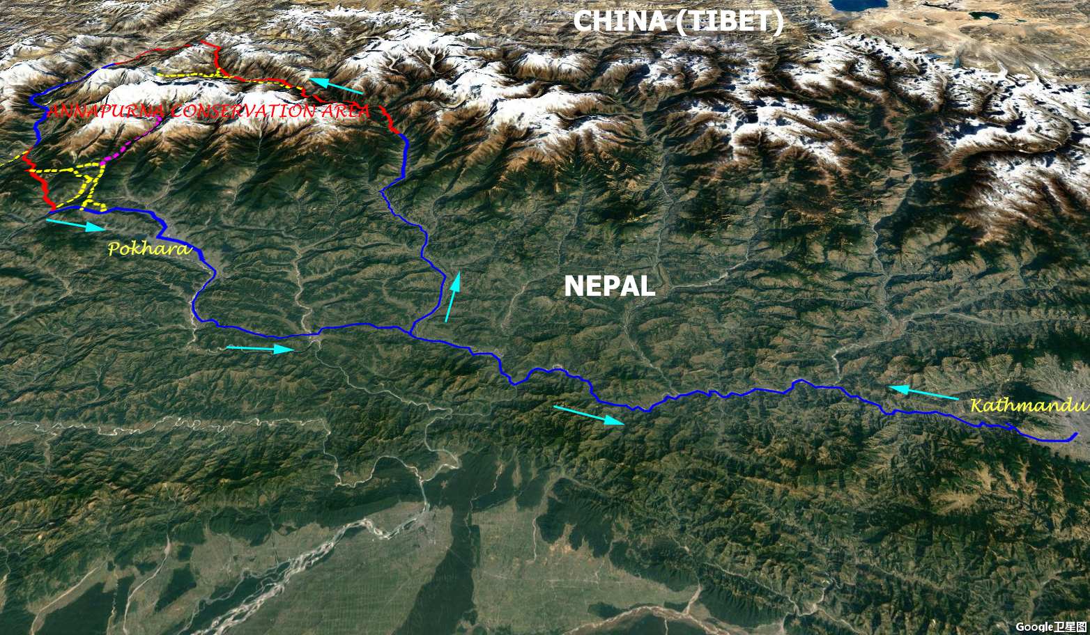附上本次行程线路图,第一张为尼泊尔境内线路,第二张为安娜普尔纳山区的徒步线路。