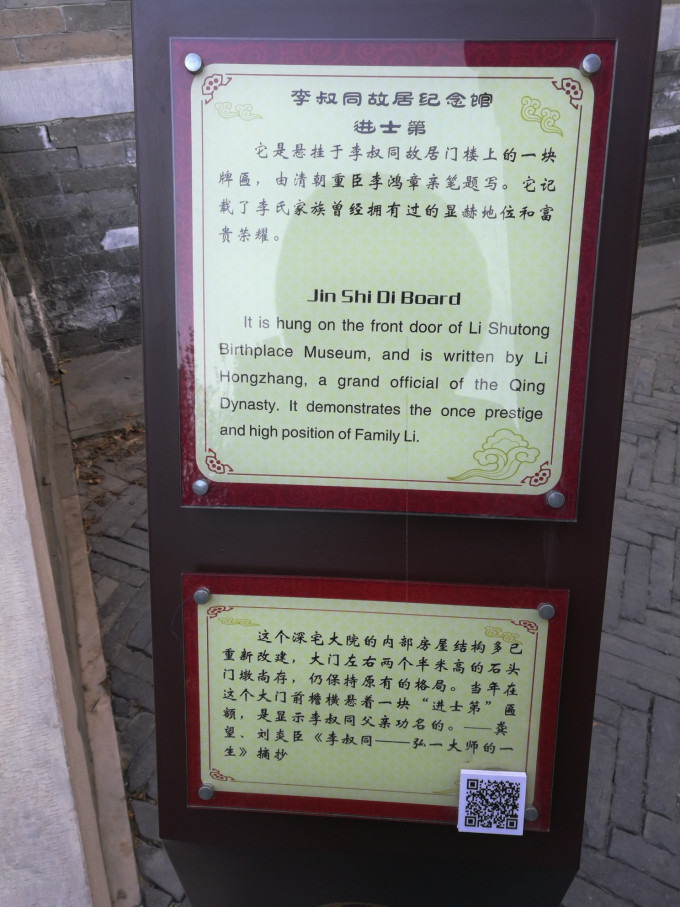 走过园林,我们就来到了故居门前。这所宅院是李叔同的父亲李世珍在60岁时买下来的,李叔同3岁时搬到这里居住,直到19岁离开天津,16年来他一直生活在这里。故居门楣上方悬挂着“进士第”的横匾。在清代,凡是进士出身的氏族,都会在门楣上悬挂进士第的匾额来彰显身份和地位。通过这块匾额也显示出了李家在天津的名望。