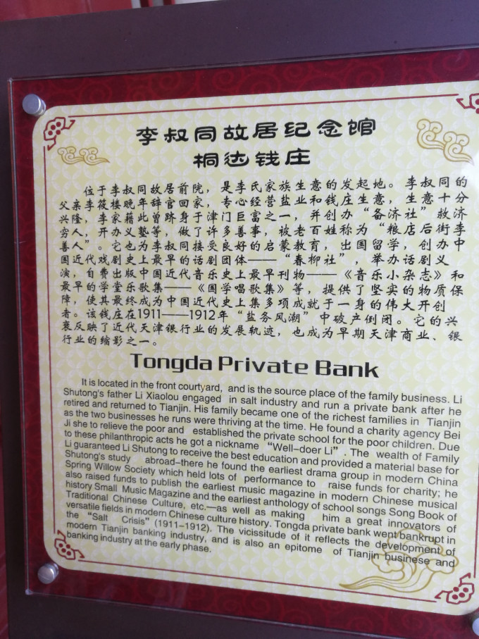 走进第一组院落便来到了桐达钱庄门前,这是李家的一个内局钱庄,主要处理内部的财务往来。在天津,李家还有一间钱庄名为桐兴茂钱庄,坐落于旧时的宫北大街一代,经营外部帐物。由于李家经营有方,理财有道,家境日益殷实。这就为李叔同日后从事各项文化艺术活动和留学日本奠定了坚实的经济基础。