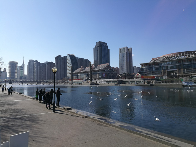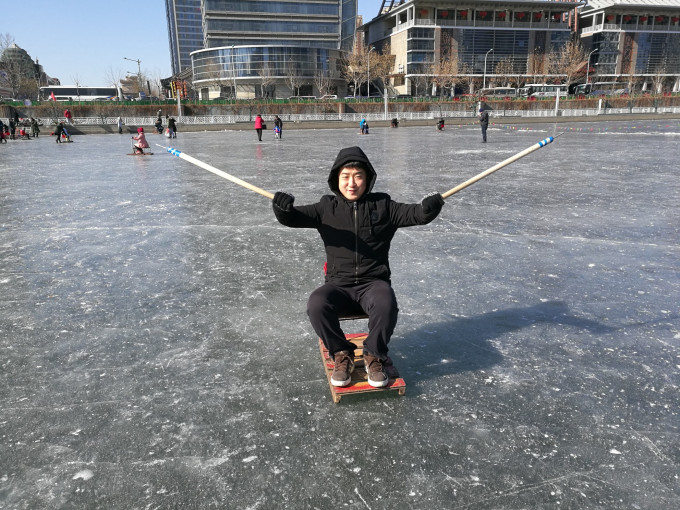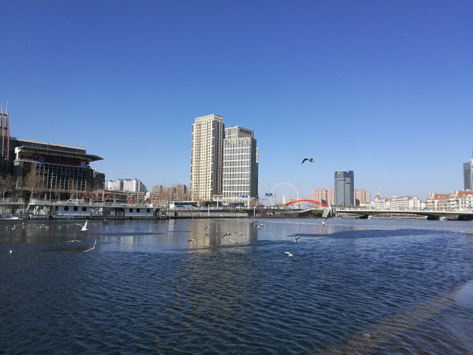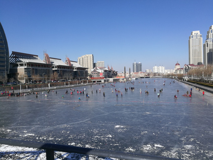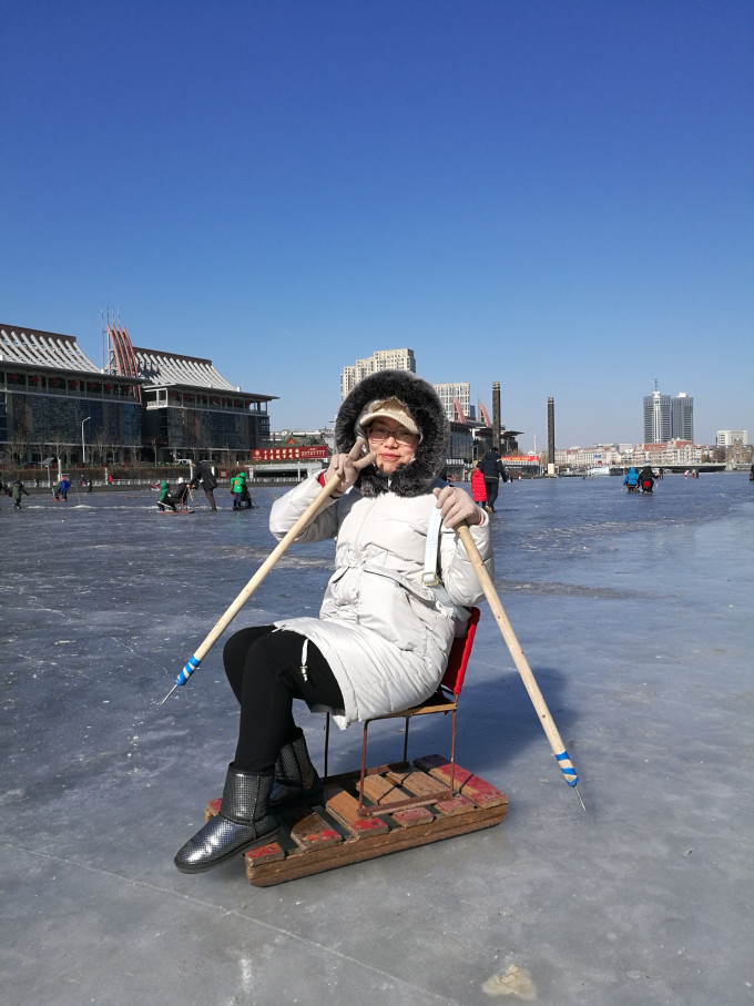 游完故居,跟老公到海河边溜达溜达。冰上结了厚厚一层冰,好多人凿冰而渔,还有好多玩扒犁的。