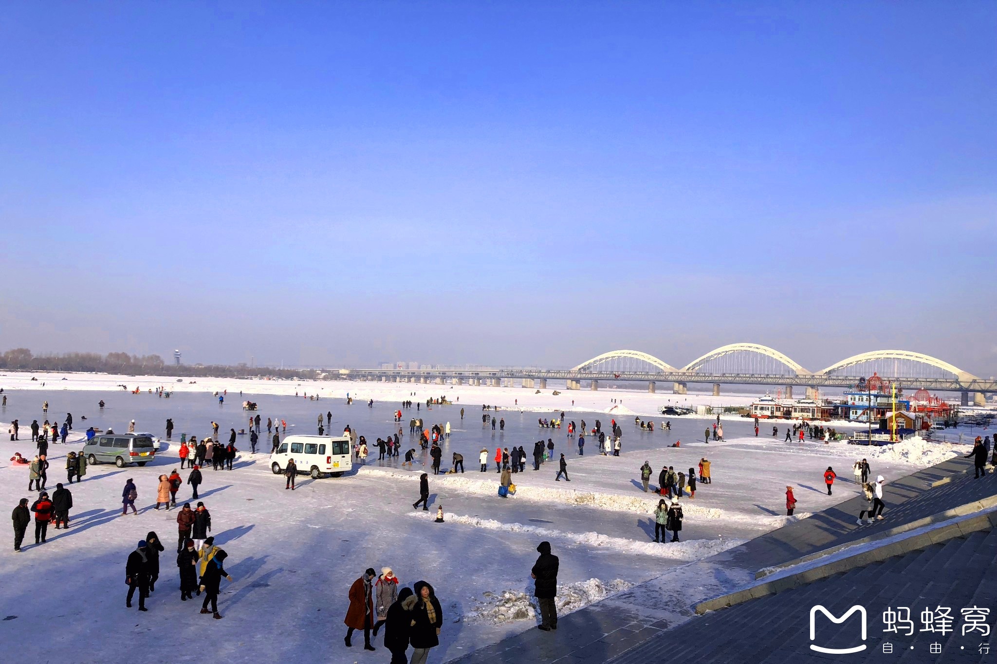在寒冬的松花江上会有许多的娱乐项目:滑雪圈,打冰嘎,雪地摩托等等等,只能感叹东北真会玩