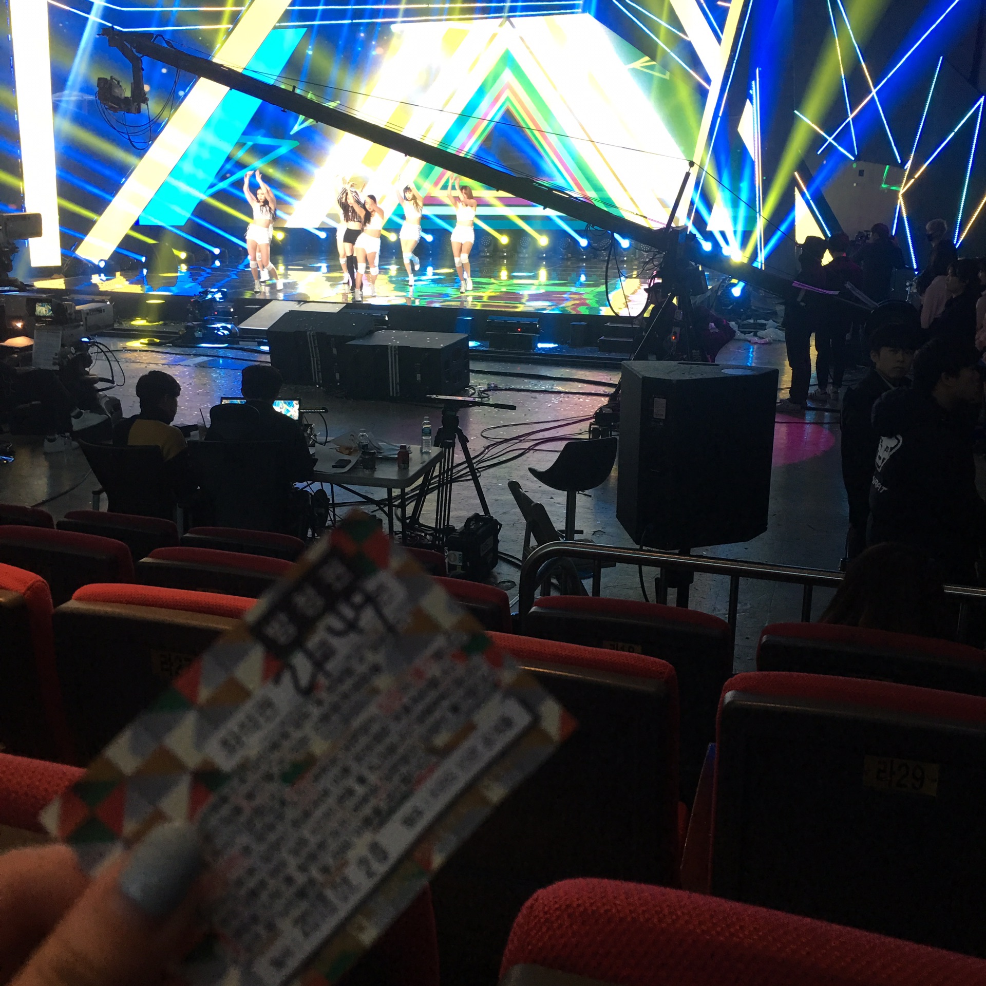 韩国时间五点四十五带上护照就要到,六点多钟进场 七点开始录制。人不算多,都是站着的,不知道哪来的好运 第一次我们站在第一排正中间,第二次站第二排,真的爱豆的皮肤啊什么的都近在眼前,这个看爱豆真的很近了,然后你爱怎么挤怎么挤,当时我们站第一排,后来有一组爱豆表演 我们后面的是他们的饭 就提出和我们换一个位置,她们要拿手幅应援,等他们爱豆表演完再换回来,我们也爽快答应了。然后这个有些是提前录制好的 所以提前录制好的 上台后表演一小段 工作人员就会催场下去 (音银好歹是表演了一大半)然后大概八点半左右结束