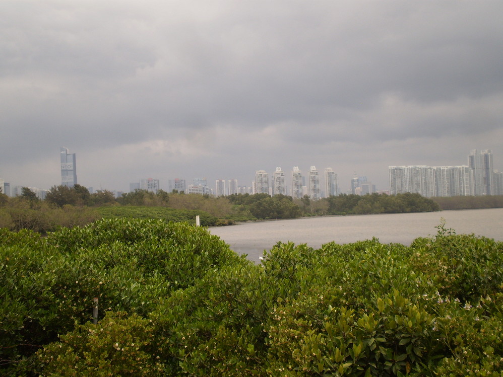 在红树林公园里,有长长的堤岸,顺着深圳湾,遥对香港的山峦.东南角上还有小片的红树林,树木根部长在泥沼和海水里,枝干发红,分布致密,挺有意思.可以下堤岸靠近去感受下(其实是不让的).