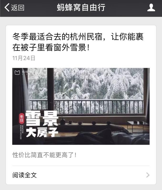 蚂蜂窝微信公众号推送了一篇:冬天裹着被子在杭州民宿看雪景!令我萌生出:“17年的最后一个月,我要去杭州偶遇雪景的冲动……”