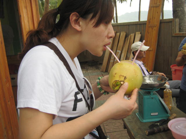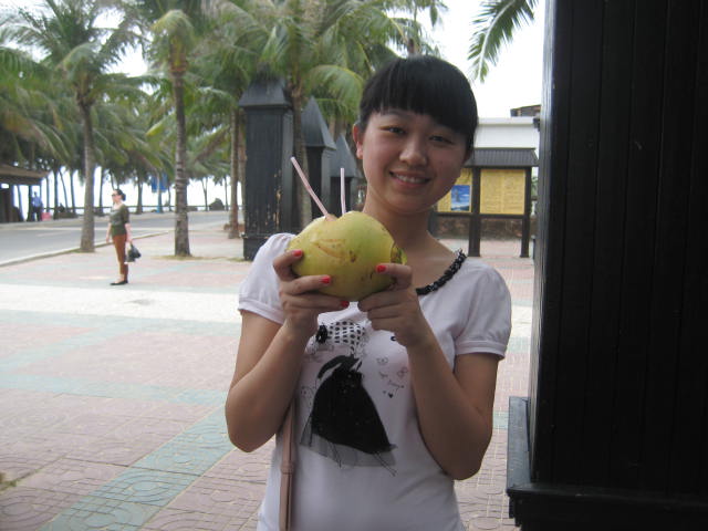 海南 的椰子真的超好喝的,甜的不得了,不像在家里喝的椰子,有股怪味,10块钱也不贵,建议大家尝尝。。。
