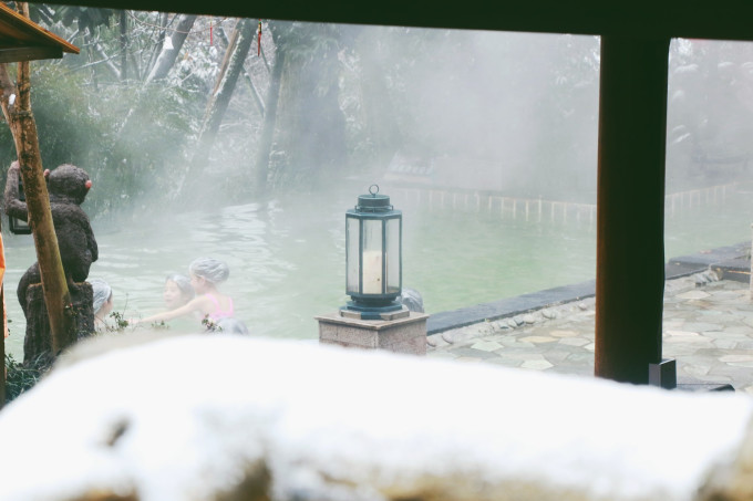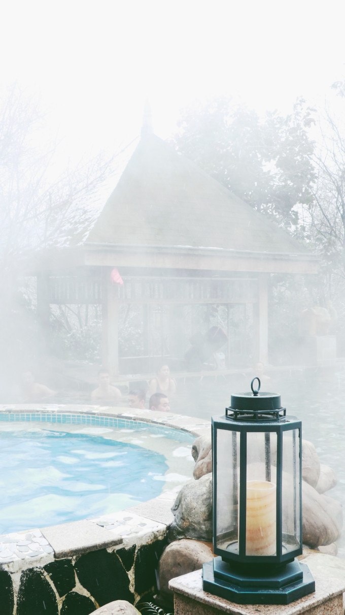 既然是冲着冰雪温泉来的,趁着柯柯办入住的功夫便绕道前台后面的温泉区探探风。温泉分为室内温泉和室外温泉,下雪的日子自然是要体验冰雪温泉才畅快~ 外边冰天雪地皑皑积雪,里面却是水汽氤氲热气腾腾,要不是还有一箱箱的行李放在车里需要先安顿,早就一鼓作气换好衣服先下池子来泡一泡。