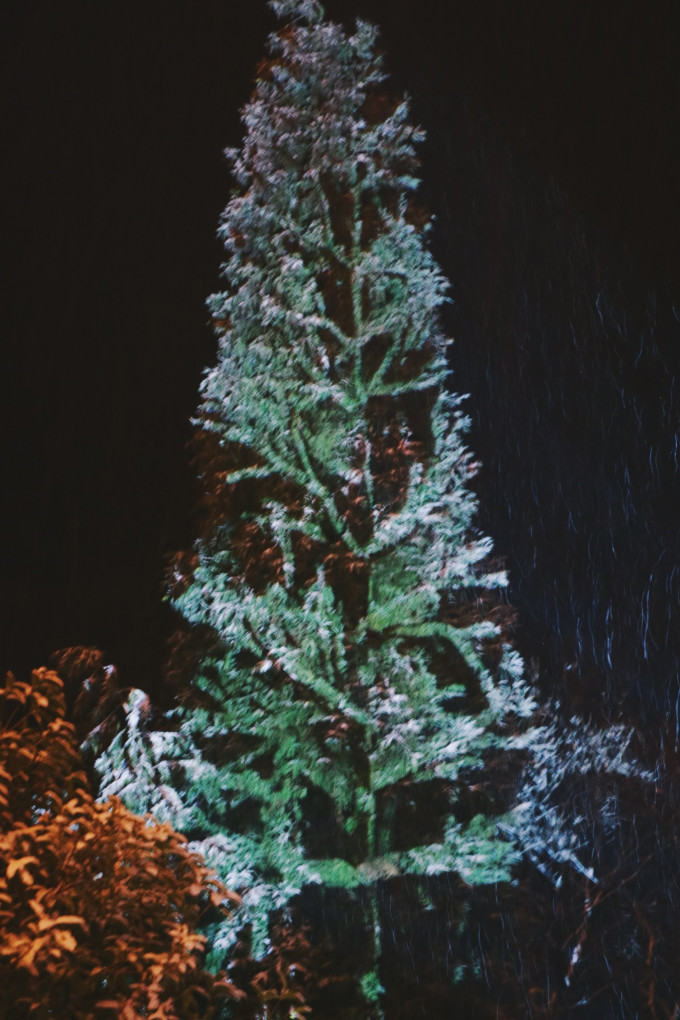 一出换衣间就感受到室外的寒冷,嗷嗷叫着要冲进池子里,却不由得地被门口一颗大树和上面的投影吸引住了目光,圣诞树、一池睡莲、旋转木马、飞舞樱花……一棵树和一个投影,却能将人瞬间带回那个快乐很简单的时代。