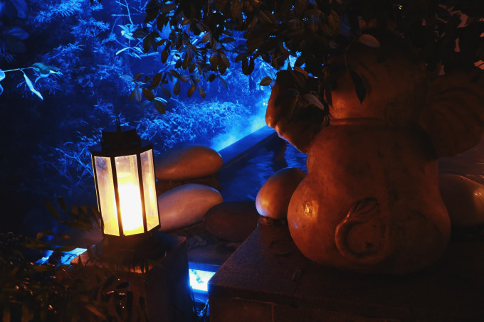 相较于白天敞开式的通透大气,晚上时候一花一草一池一木都在灯光里隐隐绰绰,平添出多种风情。