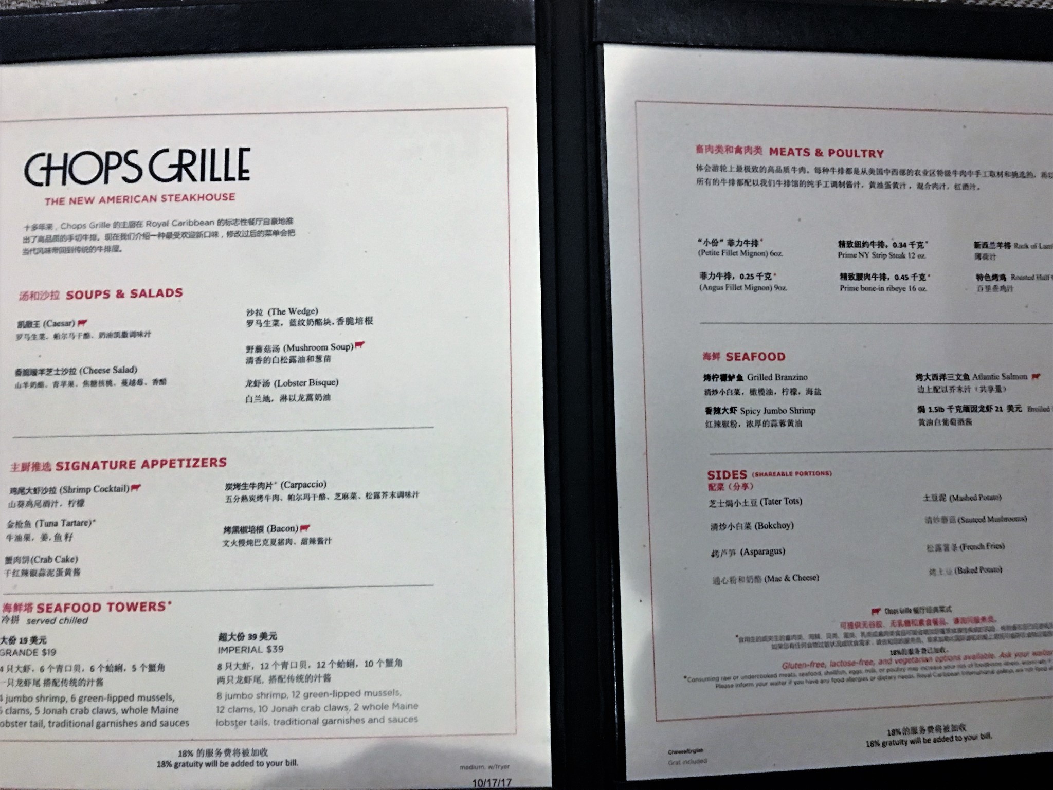 根据游长们的攻略,先前做的功课选了三家收费餐厅:仙境坊、意大利美食和牛排烧烤餐厅。上船后订餐服务员告知仙境坊换成烤鸭坊了,于是将仙境坊换成杰纽因啤酒屋(烤鱼)。三家打折下来88$(对比喜悦号,三家餐厅套餐 58$),另外同样还收18%的服务费。如果小朋友要参加的话,也要加收11.8$(喜悦号小朋友不收费)。