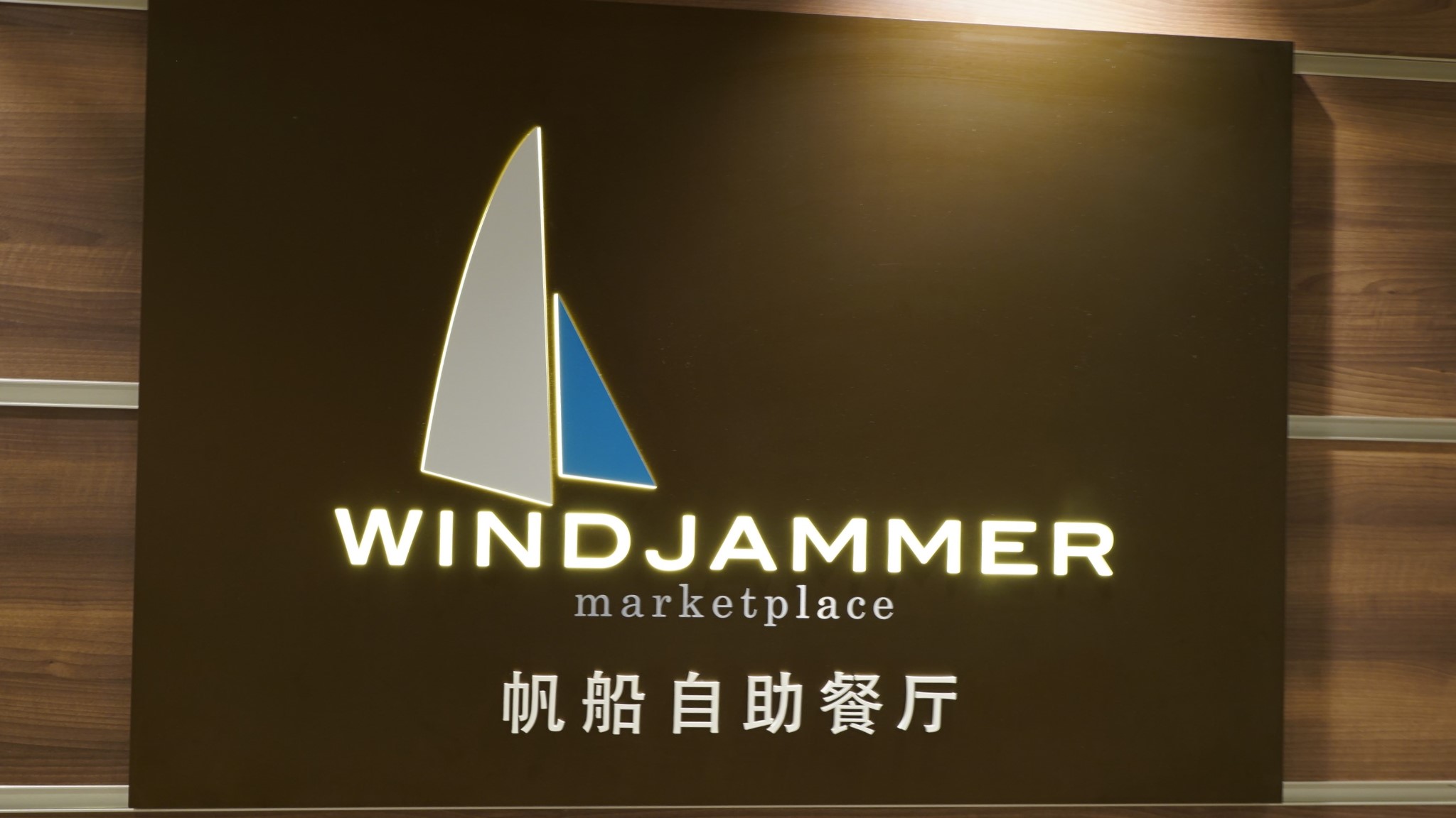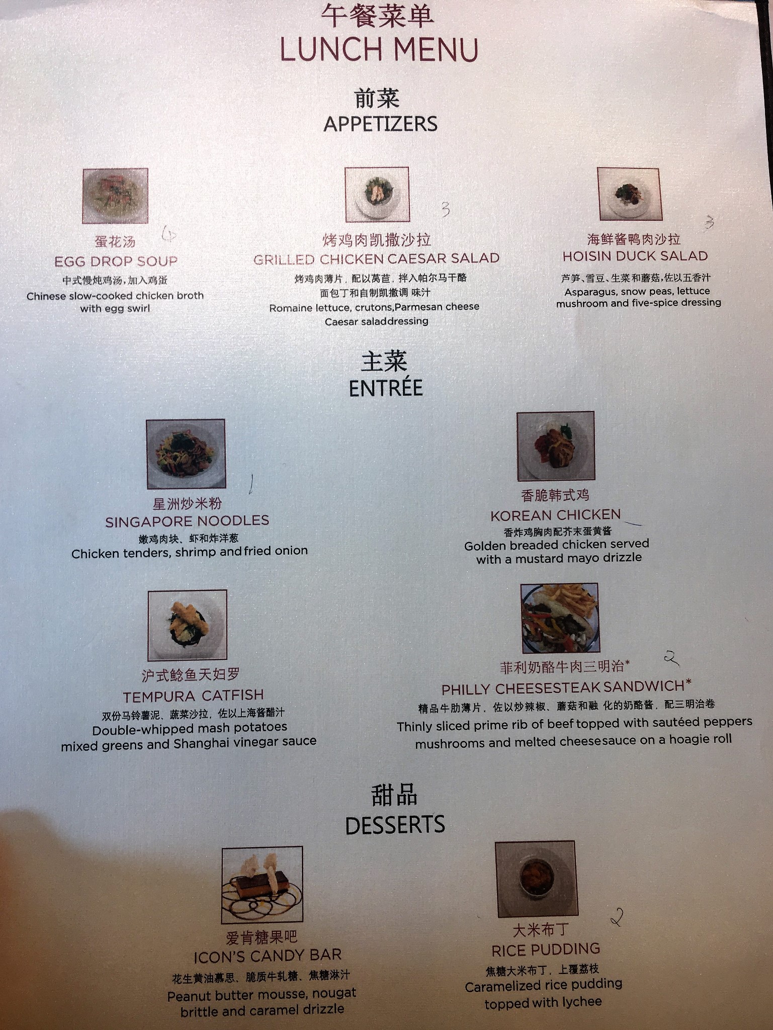 第一天午餐就选择14楼的帆船餐厅。这个餐厅是船上最大的免费餐厅,也是唯一的自助餐厅。游长们攻略绘声绘色描述成被阿姨们攻陷的餐厅。进来后人还不多,但是菜品比想象的要少。唯一的硬菜(肉)就是烤牛腿。吃了几片,拿了两个甜品。基本就差不多饱了。相比其他餐厅,帆船餐厅菜品的可选择余地较多,长辈们更加喜欢这个餐厅,到了旅程后期甚至不愿意去收费餐厅