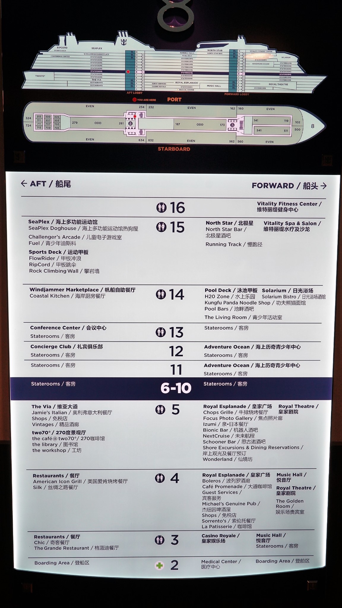 接下来就可以对整个船情况先熟悉一下。量子号船前和船后(偏中)两个电梯井,船前有6个电梯,船后有10个电梯。每层电梯旁有详细的指示牌。