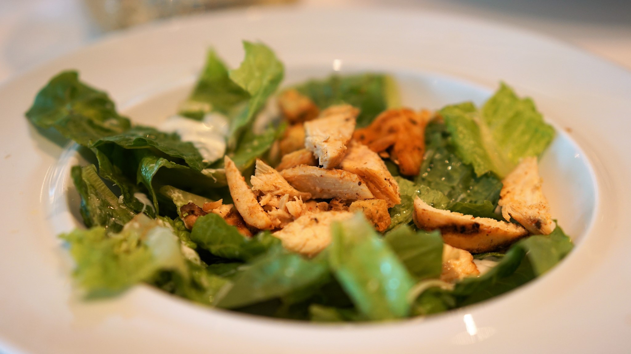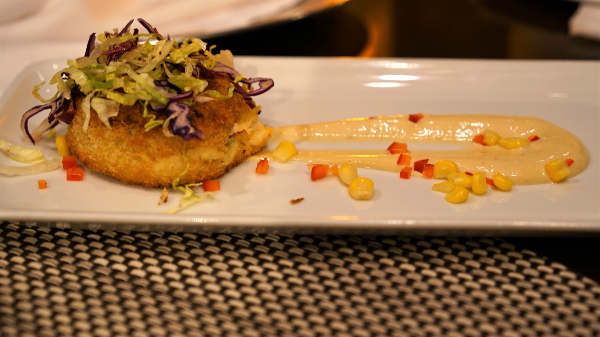 前菜我选了是沙拉,一个字概括“咸”。主厨推荐选了蟹肉饼,两个字概括“很咸”。