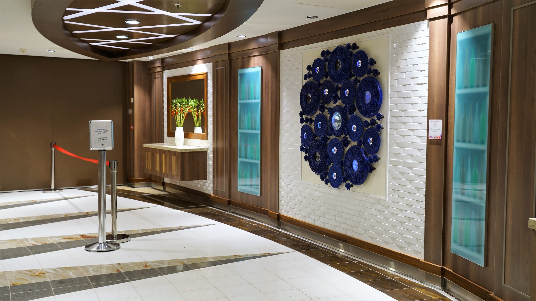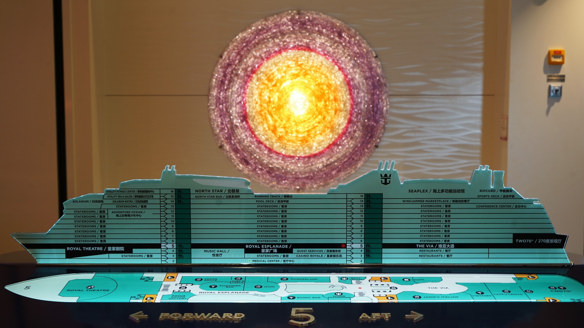 在五楼通道有一个船体模型,提供立体的指览。墙壁上有盏漂亮的圆灯,从这个角度看,就像太阳照射着量子号。