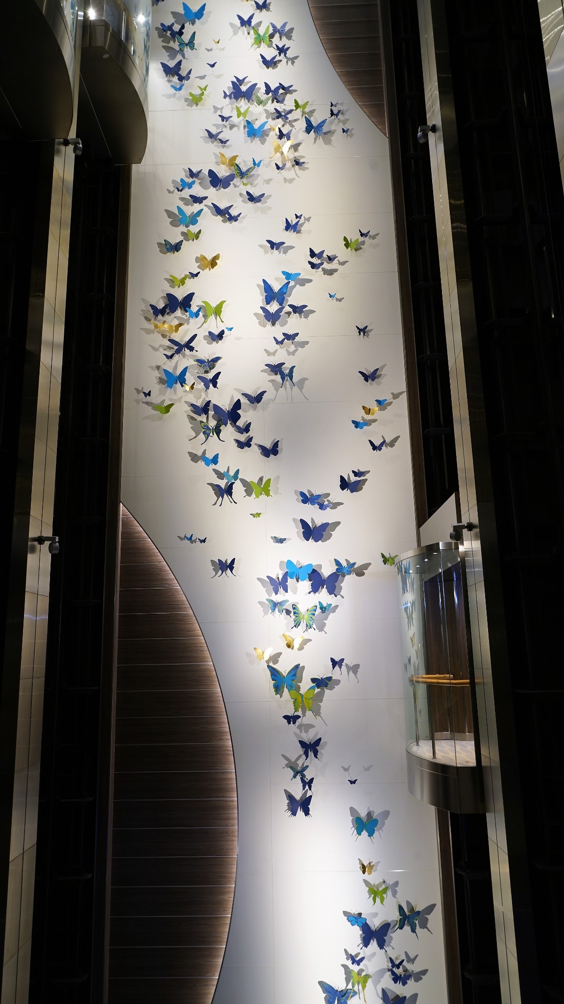 船后的电梯井中间6个电梯是透明的,从里往外一览无余。从5楼直至14楼一侧的墙壁上布满了蝴蝶。所以位置很好记,看到这个蝴蝶墙,知道身在船后处。