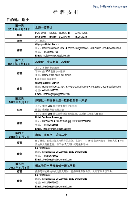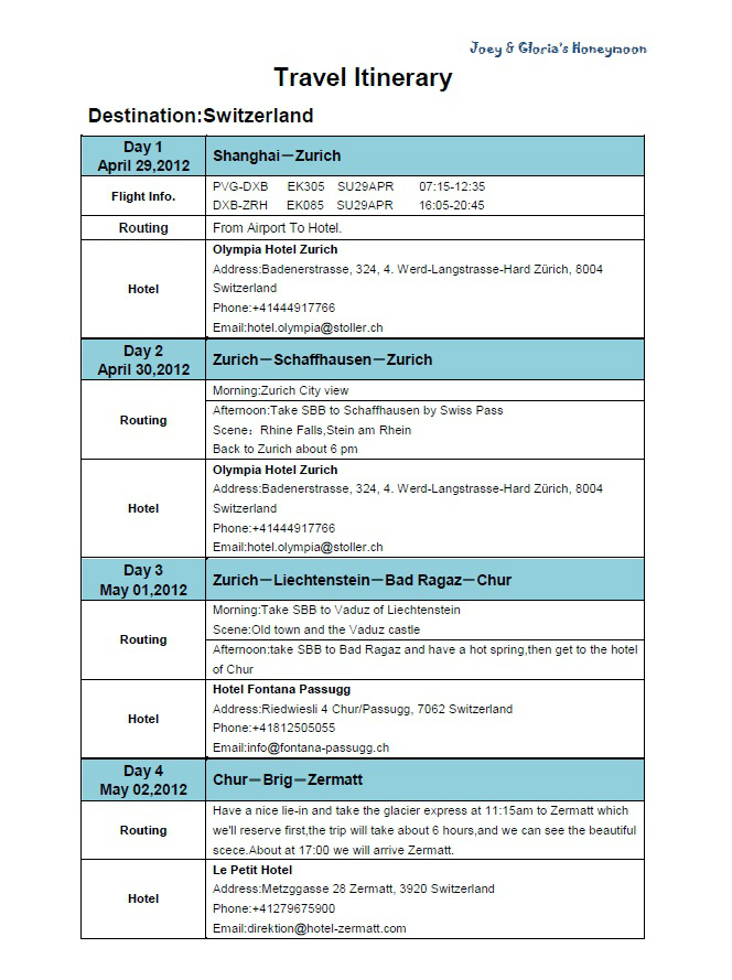 第一天 2012年4月29日上海—苏黎世第二天 2012年4月30日苏黎世—沙夫豪森—苏黎世第三天 2012年5月1日苏黎世—列支敦士登—巴特拉加茨 泡温泉—库尔