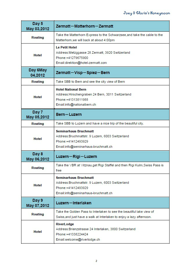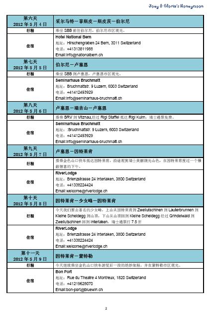 第六天 2012年5月4日 采尔马特 -菲斯皮-斯皮茨-伯尔尼第七天 2012年5月5日伯尔尼-卢塞恩第八天 2012年5月6日卢塞恩-瑞吉山-卢塞恩第九天 2012年5月7日卢塞恩-搭乘金色山口 快车 - 因特莱肯