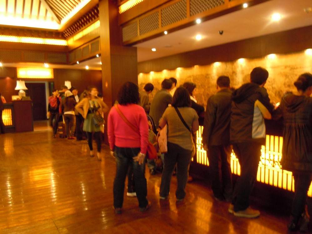 坐着摆渡回到总服务台,看到对岸百渡排队已经排到西栅入口处,最后回总服务台再次确认退房,并结帐,取行李