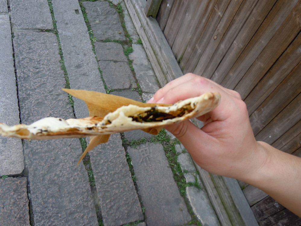 两张面皮中间撒上梅菜然后做成烧饼,面皮很脆,也很好吃