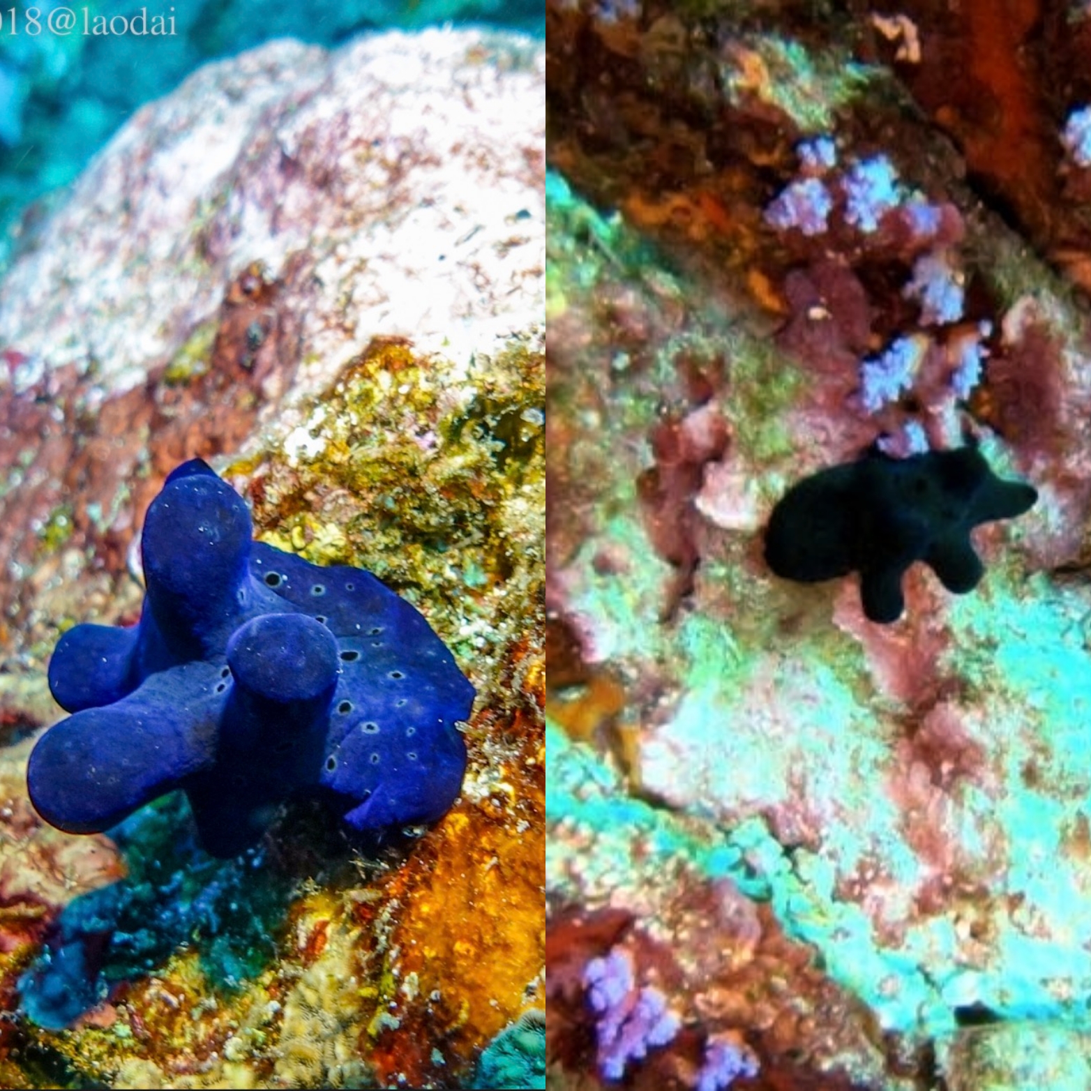 同船的朝阳区人民戴先生带了一个水下相机,不得不说,效果确实好,上个对比图就知道差距有多大了,当然也不排除我滤镜太渣以及照的不是同一只海蜗牛的因素……