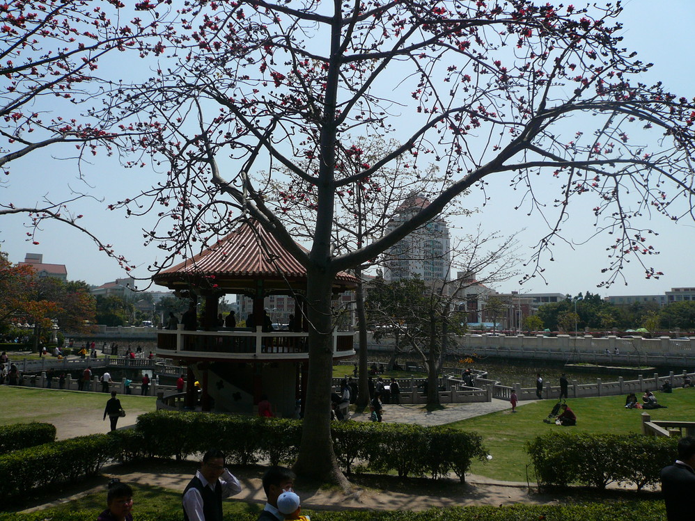 呈八角形重檐飞脊,覆以黄瓦皇冠式大屋盖,周围白石雕栏,造型新颖,