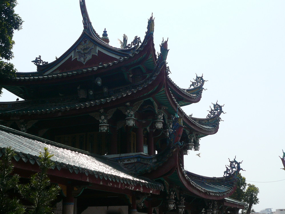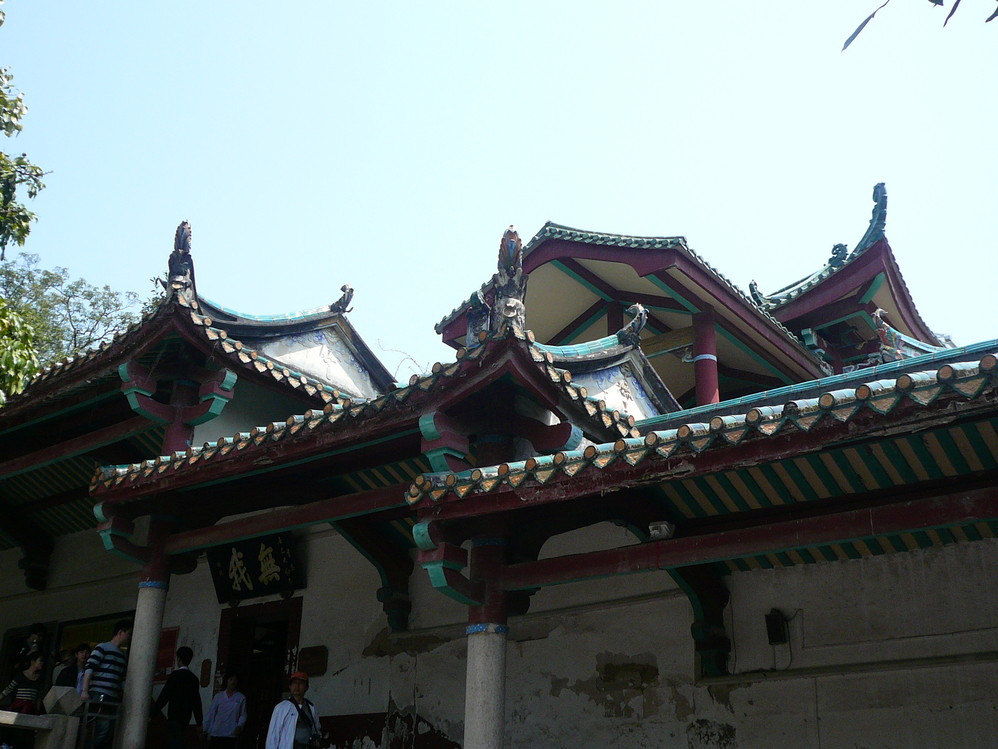 主殿呈八角形三重飞檐,中间藻井由斗拱层层迭架而成,造型巧妙,