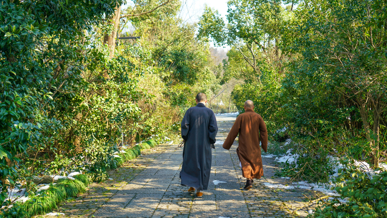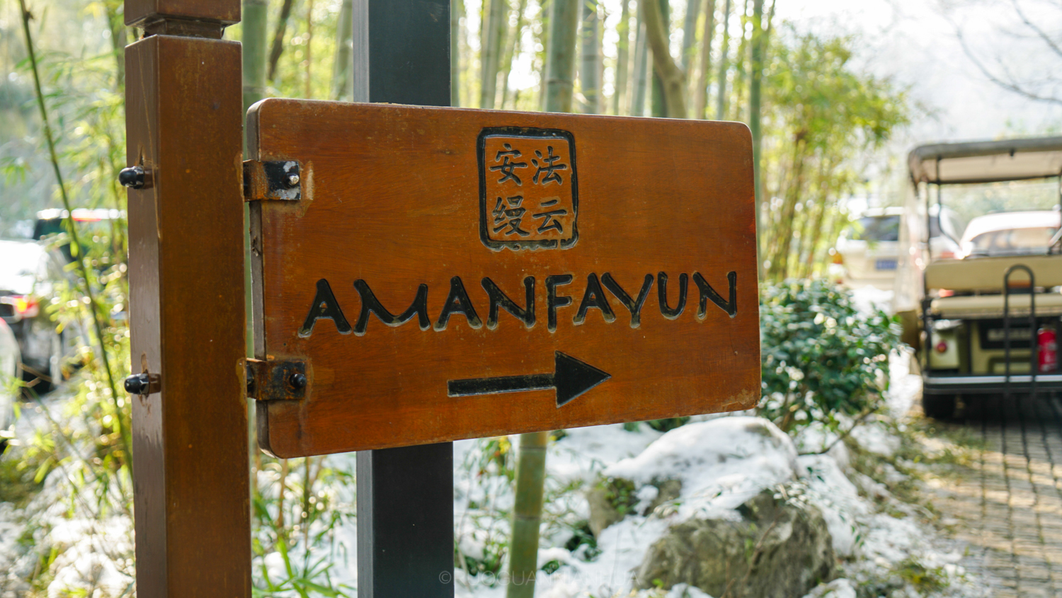 法云安缦坐落在灵隐寺景区里,距离市区也不过20分钟车程。虽和灵隐寺一墙之隔,不过由于其过于低调,很多出租车司机都未曾听说。由于下雪遇到堵车,手机地图显示距离酒店不远,我们干脆提前下车步行前往,只是没想到法云安缦大门入口无比低调,一不小心竟然走过头了。