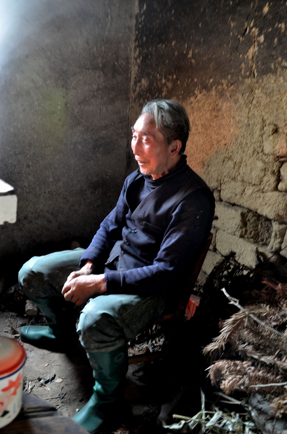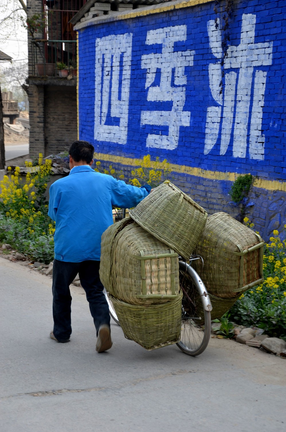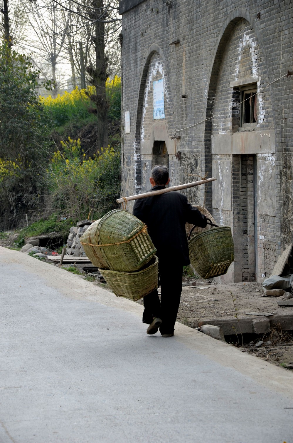 途中所遇老伯,挑着自己编的篾框,下山卖