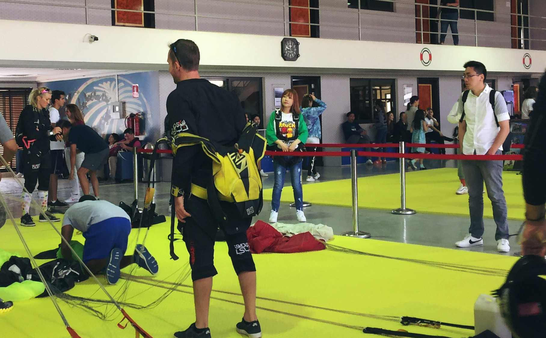 13 教练帮助穿好防护衣后他会去取伞包!不要随意走动!摄像师会在这时来采访!他们俩找不到你就麻烦了!时刻跟在教练的后面!教练允许再上飞机!