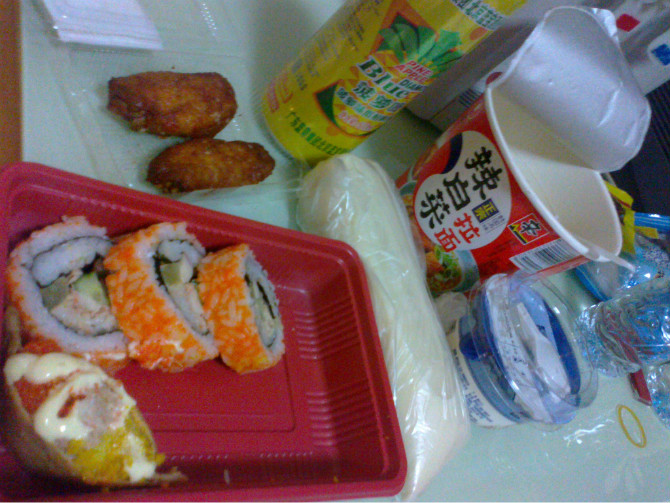 因为没吃成韩国餐 所以买了辣白菜泡面安慰自己 好吧 上面的寿司 菠萝啤 鸡翅 酸奶 豆浆 泡面 都是我一个人解决的 吼吼 大胃王呀