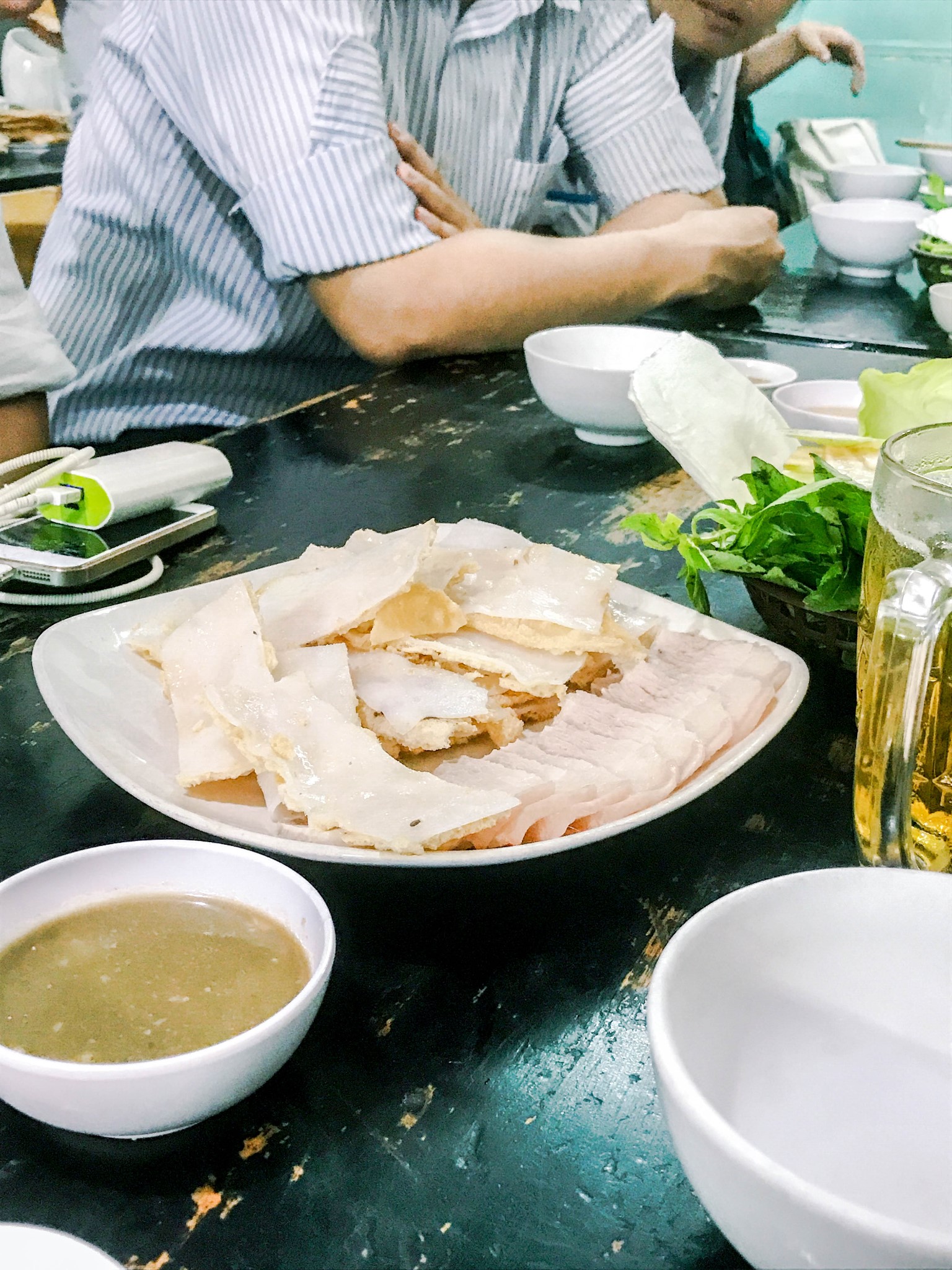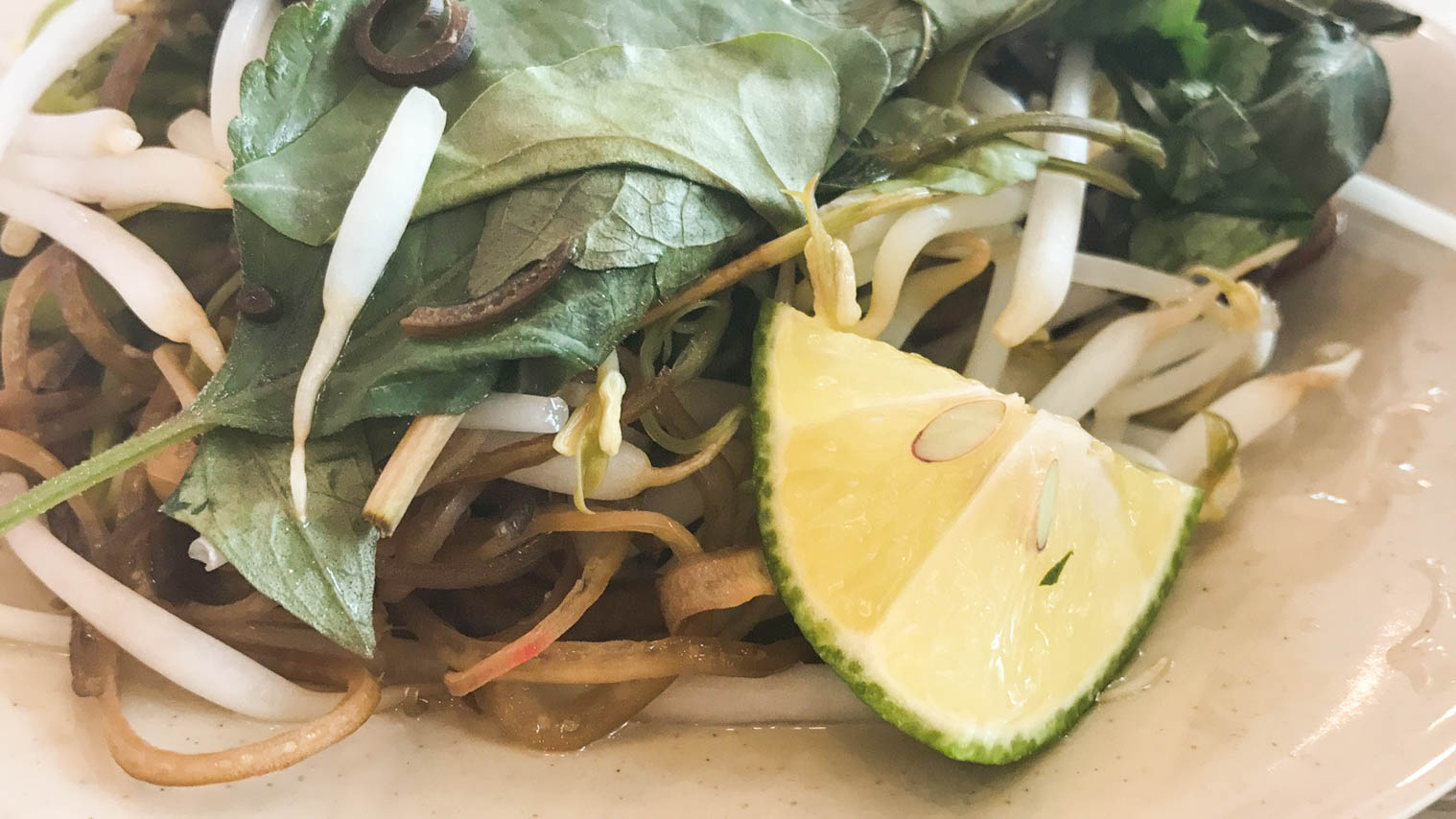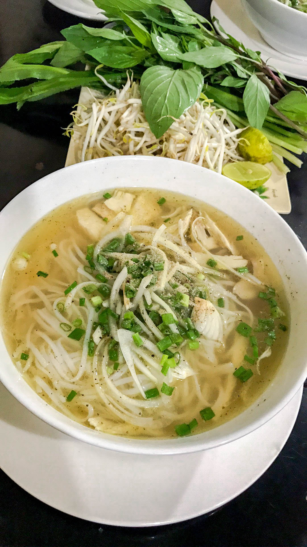 很有趣的是越南吃粉都会有配一盘菜,我想尝试直接就把整个一棵扔进汤里,非常尴尬的是旁边老板过来给我把这棵菜捡了出来,开始摘上面叶子丢进我的粉里,想必他应该看不下去很久了吧。