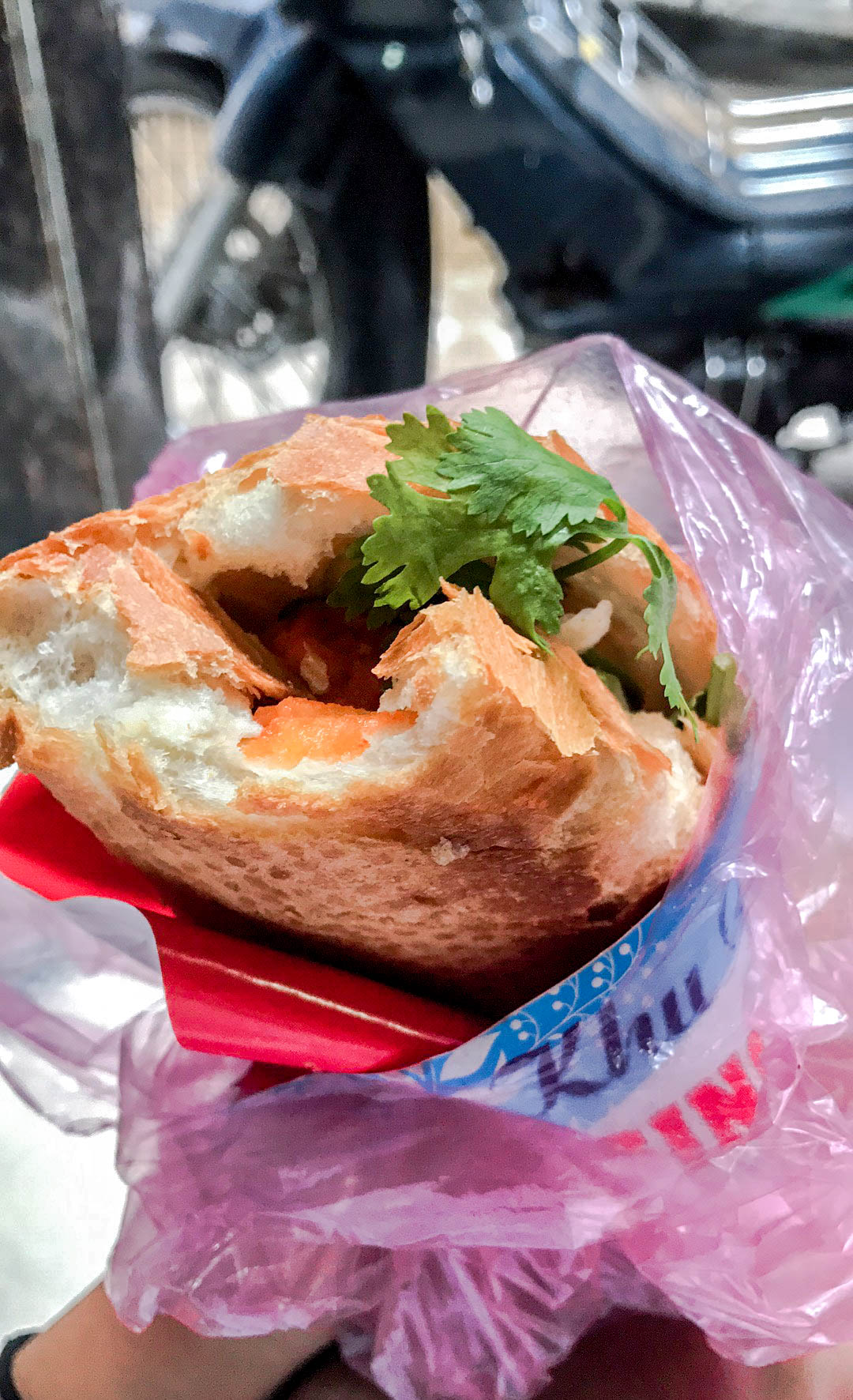 在越南,大街小巷都有卖法棍的摊贩,拉着小车,要价也很便宜,是平时的小吃零食。