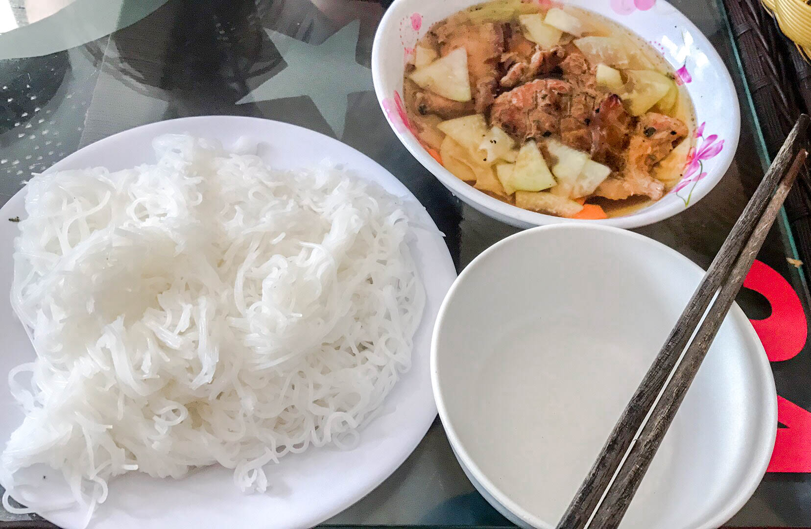 据说越南北方人偏爱这种粉,南方人就吃汤粉。“酸甜粉”是由一坨煮好的米粉和一碗带肉和蔬菜的酸酸甜甜汤组成,吃的时候把粉和汤混合吃,怎么样吃都行。